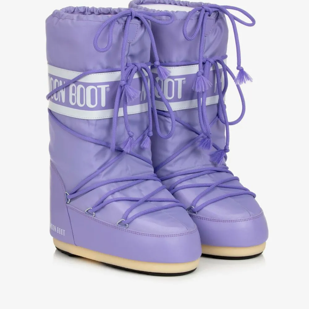 Lilac purple snow boots for boys and girls by Moon Boot, with a white logo print panel for a bold, branded look. Heavily padded and ultra resistant in the original style, they feature a two-tone thermoplastic sole with little suction pads at the bottom for improved grip. They have faux leather trims, a stylish lace-up look and a drawstring ties on the ankles to lock in warmth. The technological foam lining will feel snug at first but will mould to the size and shape of the foot after a few hours of wear.