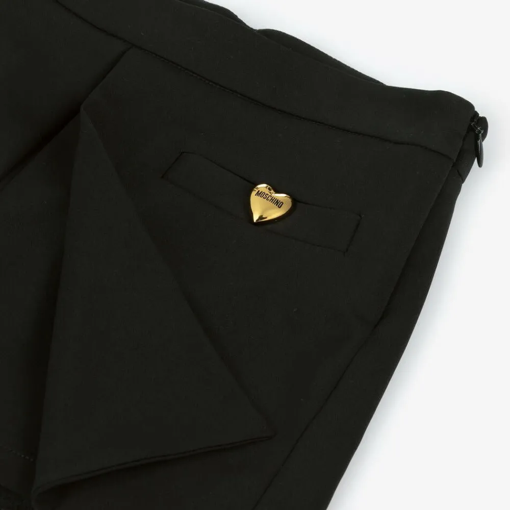 Both smart and stylish, these black shorts for girls by Moschino Kid-Teen, are made from soft, smooth crêpe. There is a split overlay on the front detailed with faux pockets and shiny gold, branded hearts for instant designer appeal. The waistband is adjustable for an ideal fit and for a neat finish, there is a concealed zip fastening on one side.
