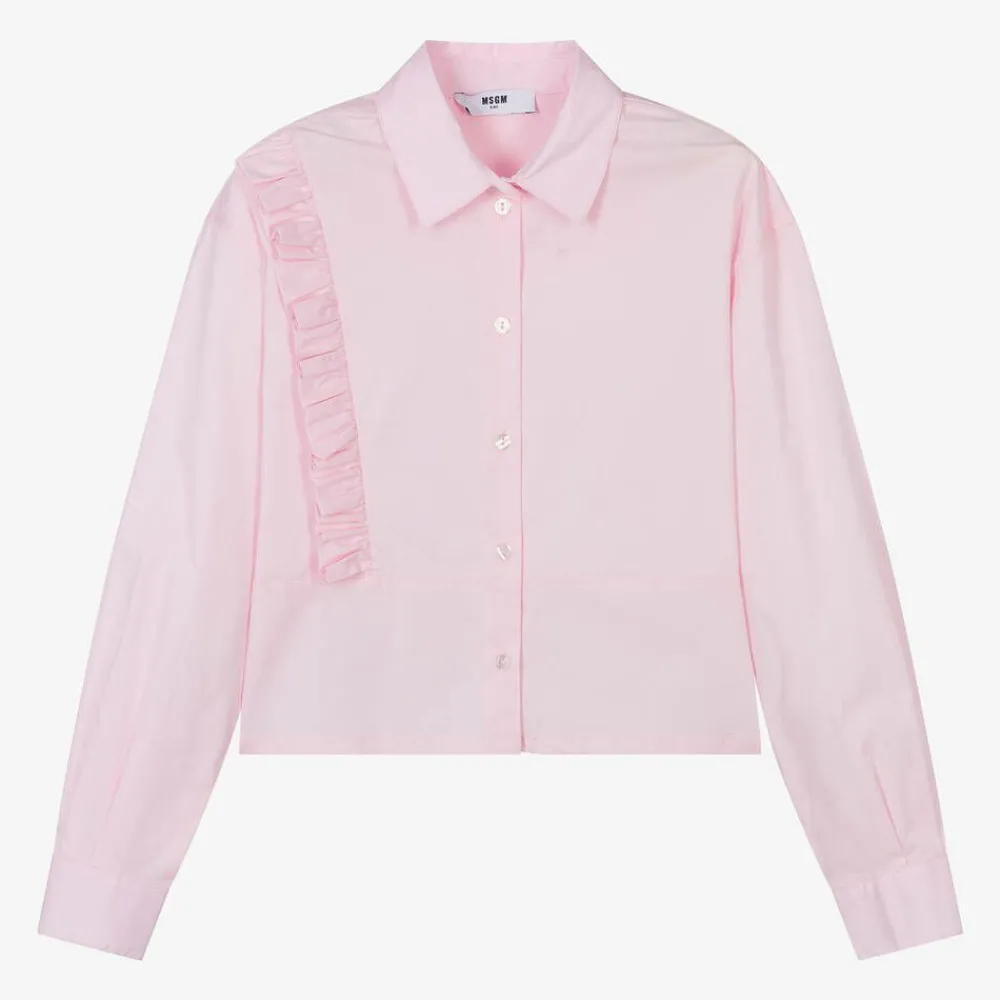A pink long-sleeved blouse for girls by Italian brand MSGM, made from soft and lightweight cotton poplin. With a pointed collar and branded button fastenings, this lovely blouse is trimmed on one side with a pretty ruffle for a stylish touch. For a discreet designer finish, there is a pink and white logo embroidered on the back.