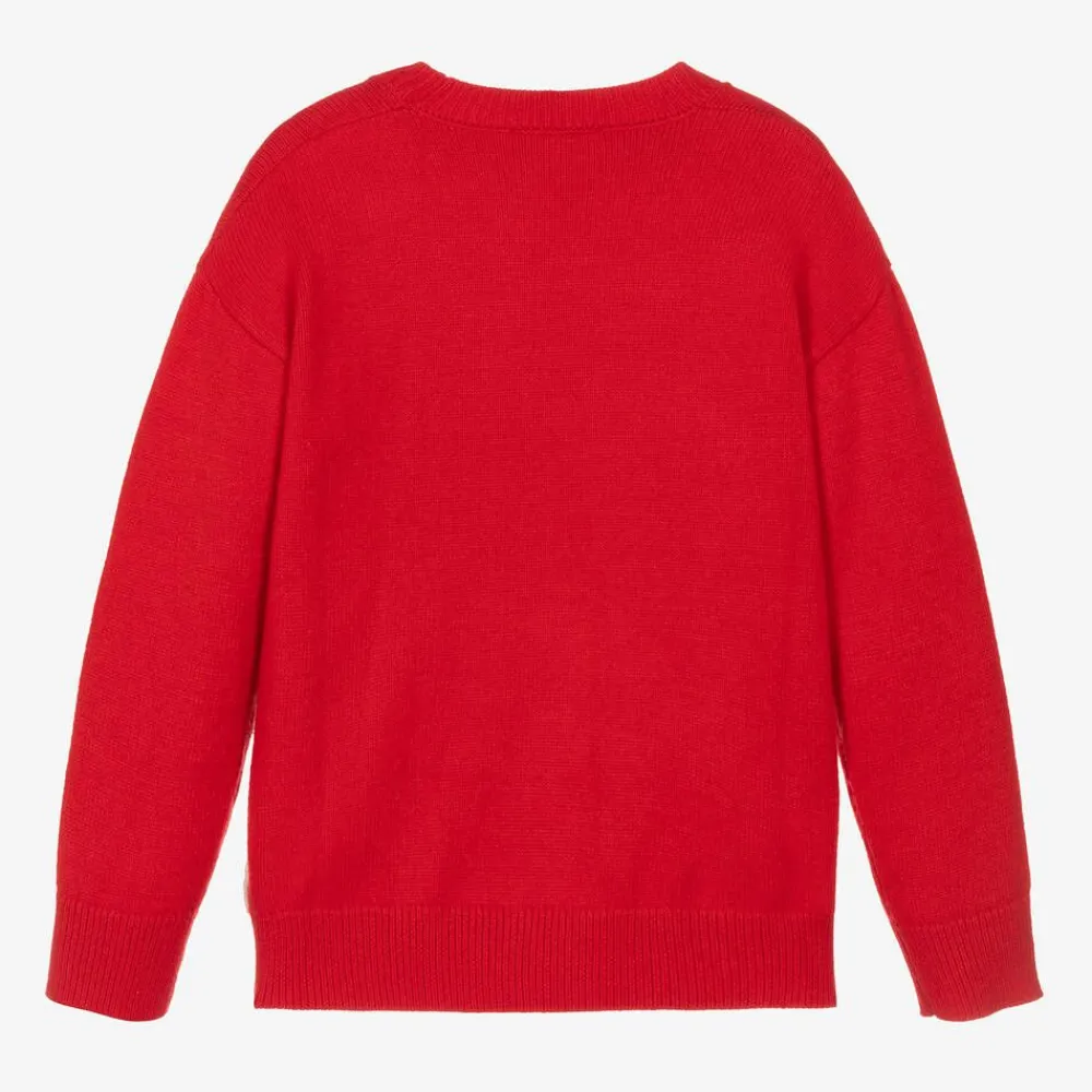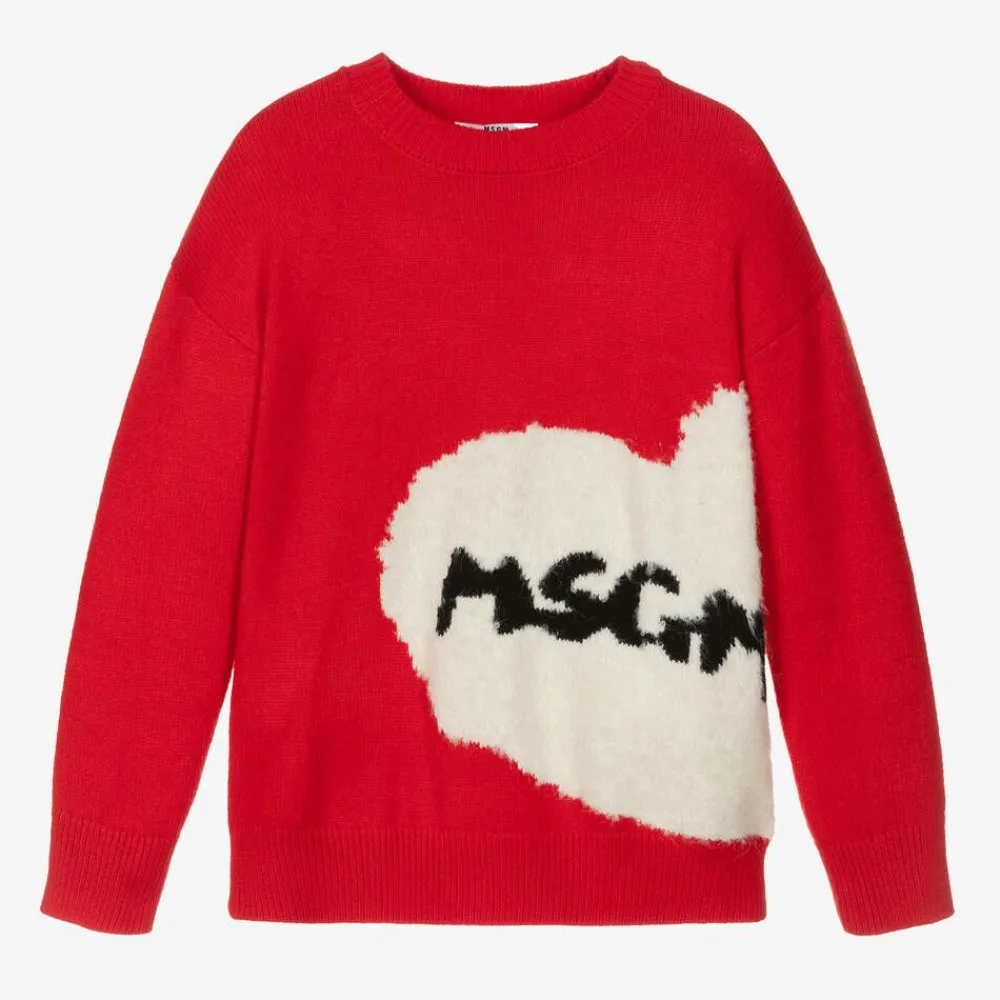 Gorgeous red sweater for girls by MSGM, knitted in a soft viscose blend. Lovely for layering up on colder days, it has an intarsia ivory and black bouclé logo heart on the front for a bold, love-inspired look. The long sleeves, crew neckline and hem are all ribbed for comfort.
