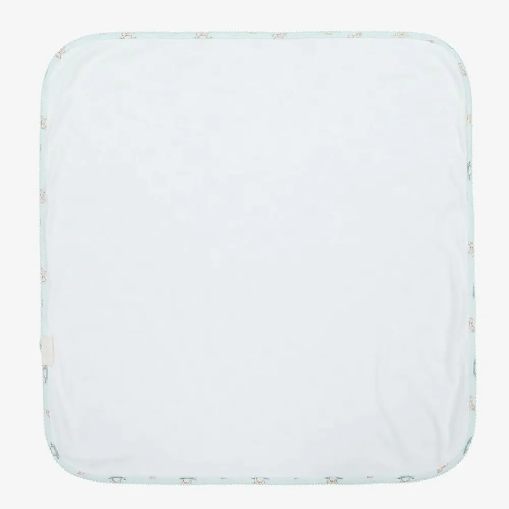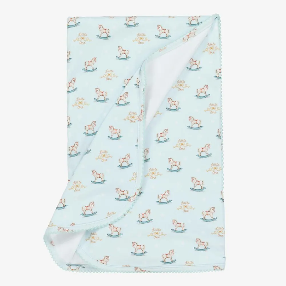 Pale blue blanket for baby boys by My Little Pie, made in a double layer of super soft organic Supima cotton jersey. With an embroidered picot trim, this lovely nursery accessory is patterned with a charming rocking horse print, with the words 'Little One' adding a sweet touch.