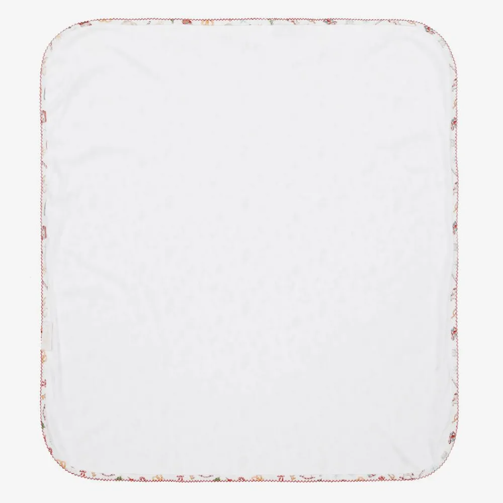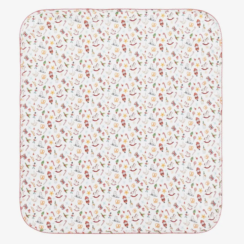 Patterned in a delightful Christmas-themed print in red and green, this white blanket for baby boys and girls is by My Little Pie. It is made in a double layer of super soft organic Supima cotton jersey, with delicate picot embroidery trim. Ideal for use in the car seat or stroller, it also makes an attractive nursery accessory.