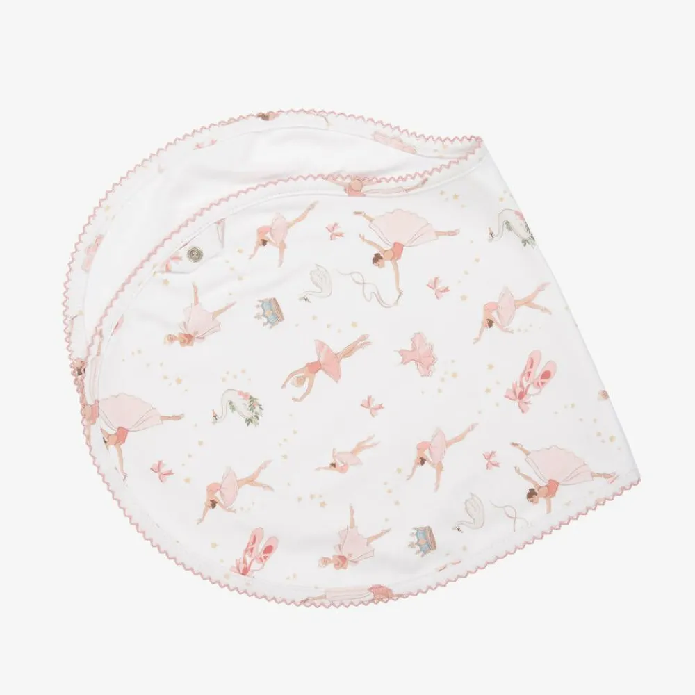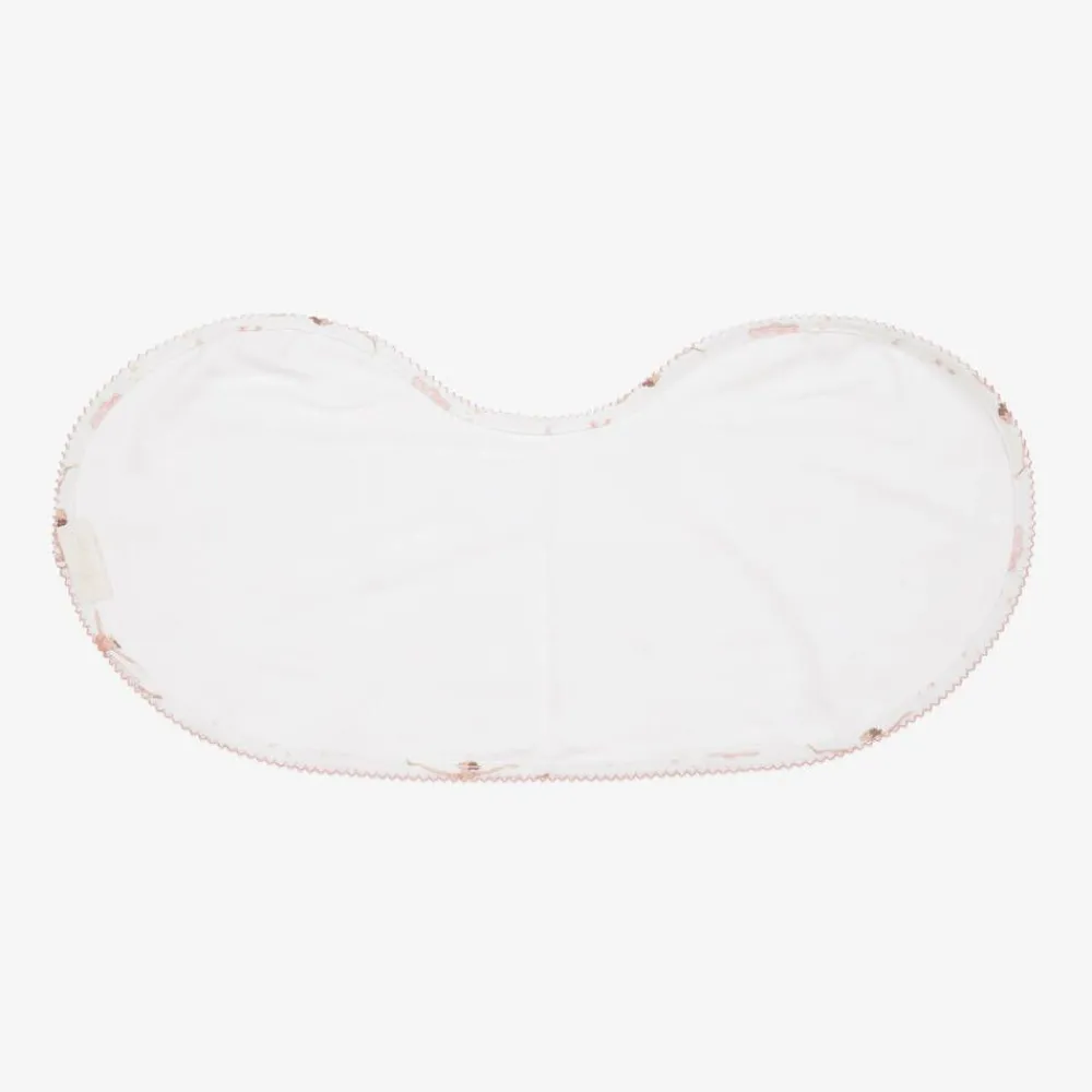 White burp cloth for baby girls from My Little Pie, patterned with a charming ballerina and swan design in pink. Made in super soft, organic Supima cotton jersey, this generous sized feeding accessory has a unique shape making it ideal as a burping cloth. It can also be used as an absorbent bib, securing easily with a popper.