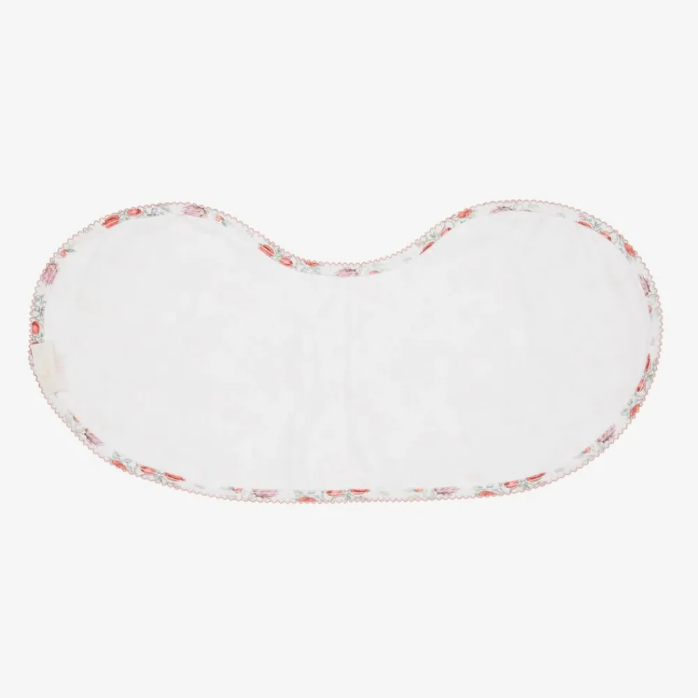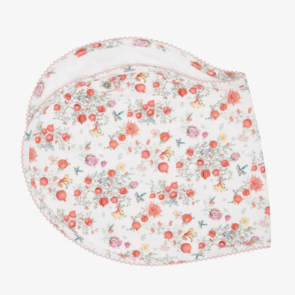White burp cloth for baby girls from My Little Pie, with a lovely, red pomegranate pattern and embroidered picot trim. Generously sized, it is made in wonderfully soft, organic Supima cotton jersey. The unique shape makes it ideal as a burping cloth or it can be used as an absorbent bib with a secure popper fastening.