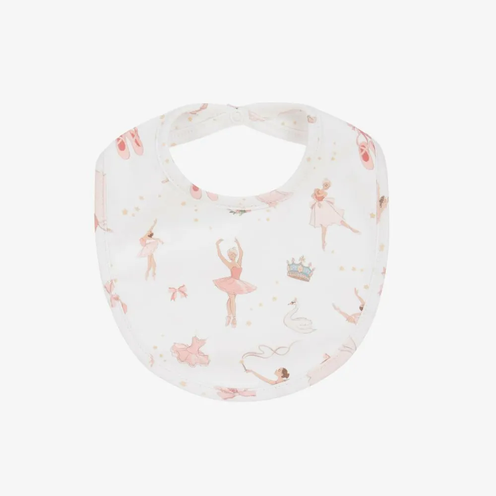 A white bib for baby girls by My Little Pie, made and lined in super soft, organic Supima cotton jersey. Great for catching little spills, this sweet feeding accessory is patterned with a charming ballerina and swan print in pink. It secures easily on the back of the neck with a popper.