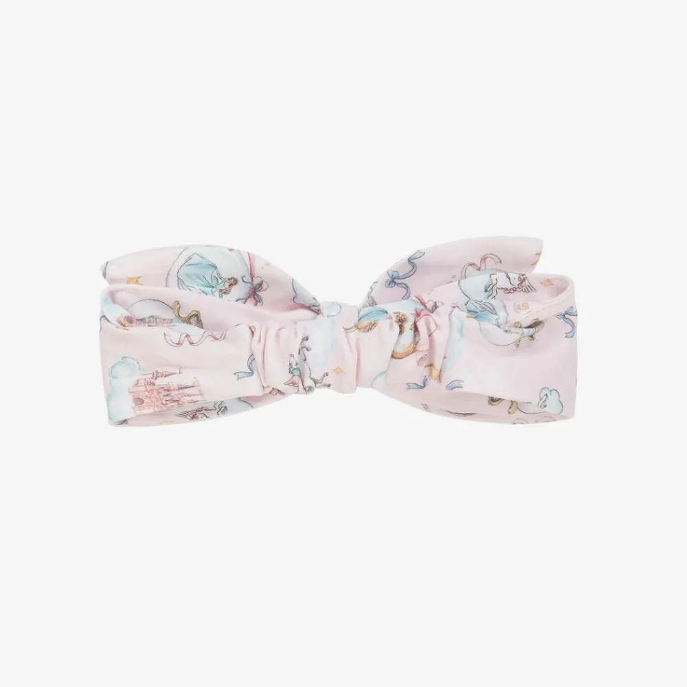 Pale pink headband for baby girls by My Little Pie, with a charming fairy tale princess and castle print. Made in soft organic Supima cotton jersey, it is comfortably elasticated at the back, with a sweet bow detail on the front.