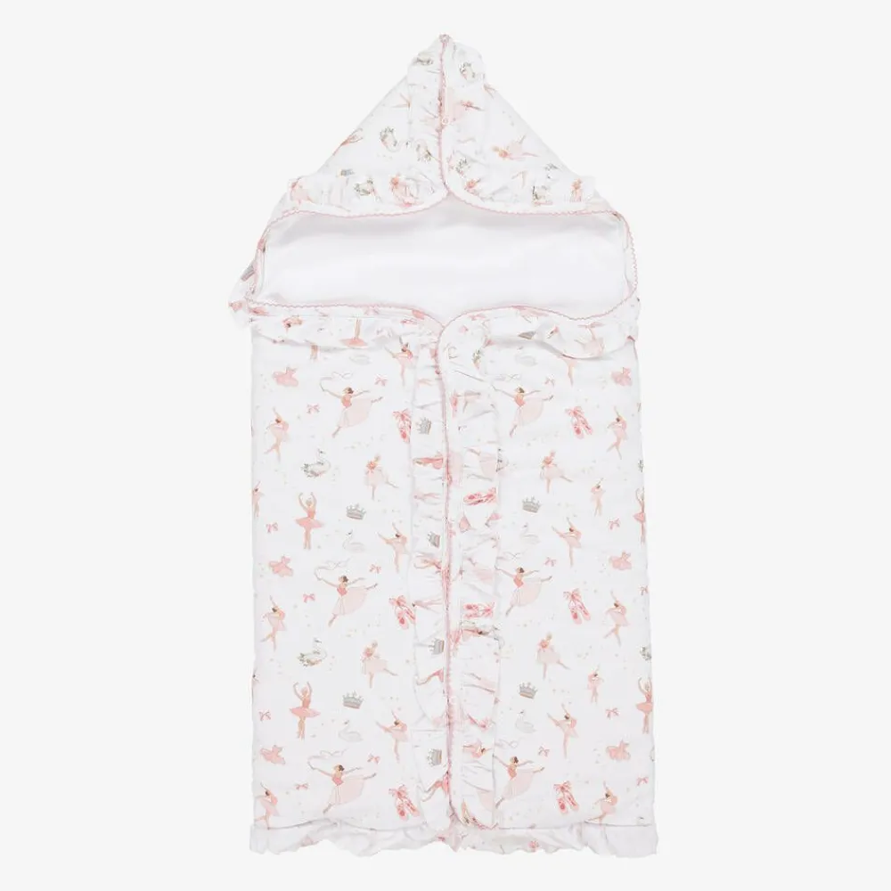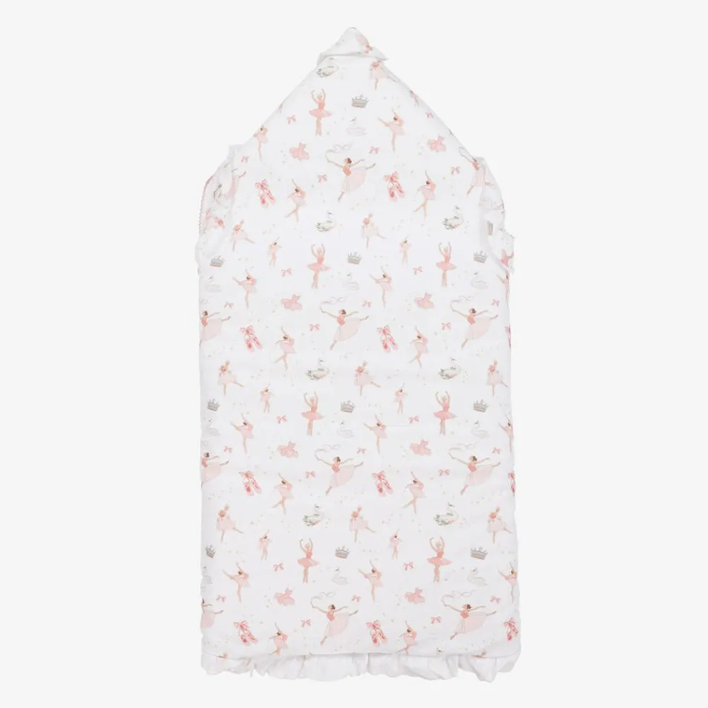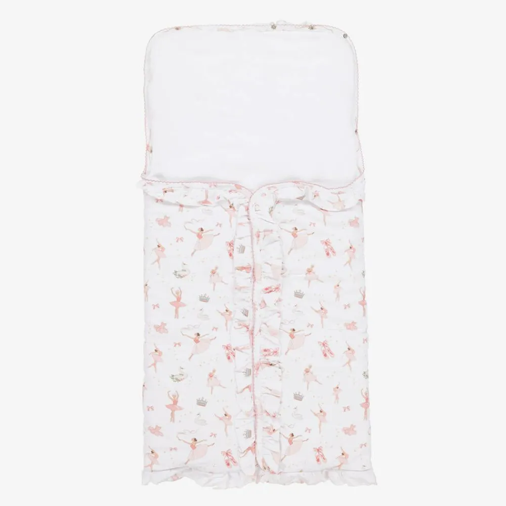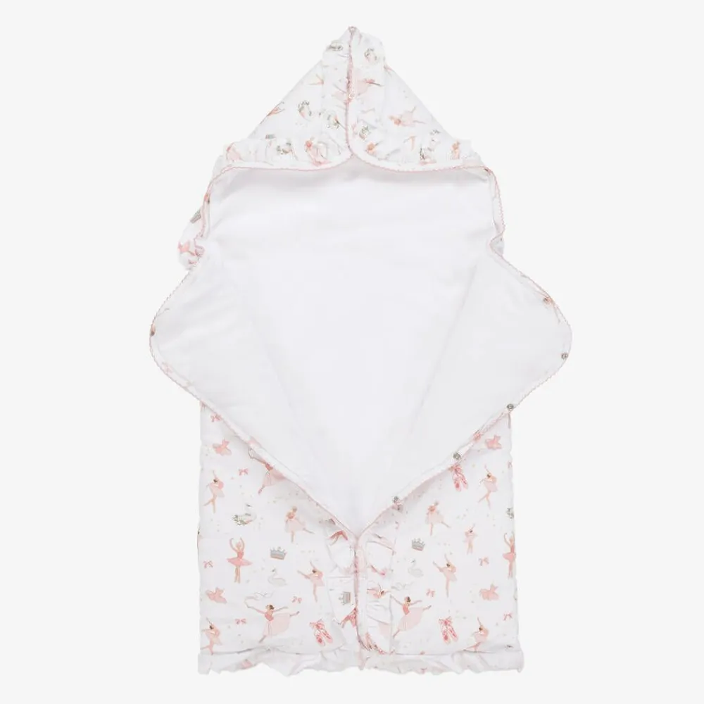 White nest for baby girls by My Little Pie, made from beautifully soft organic Supima cotton jersey and gently padded for an extra cosy feel. It is patterned with a charming ballerina and swan design in pink and edged with a pretty ruffle and embroidered, pink picot trim. There are popper fastenings on the front and hood, allowing it to be opened and laid flat, providing a comfortable surface for changing or playing.