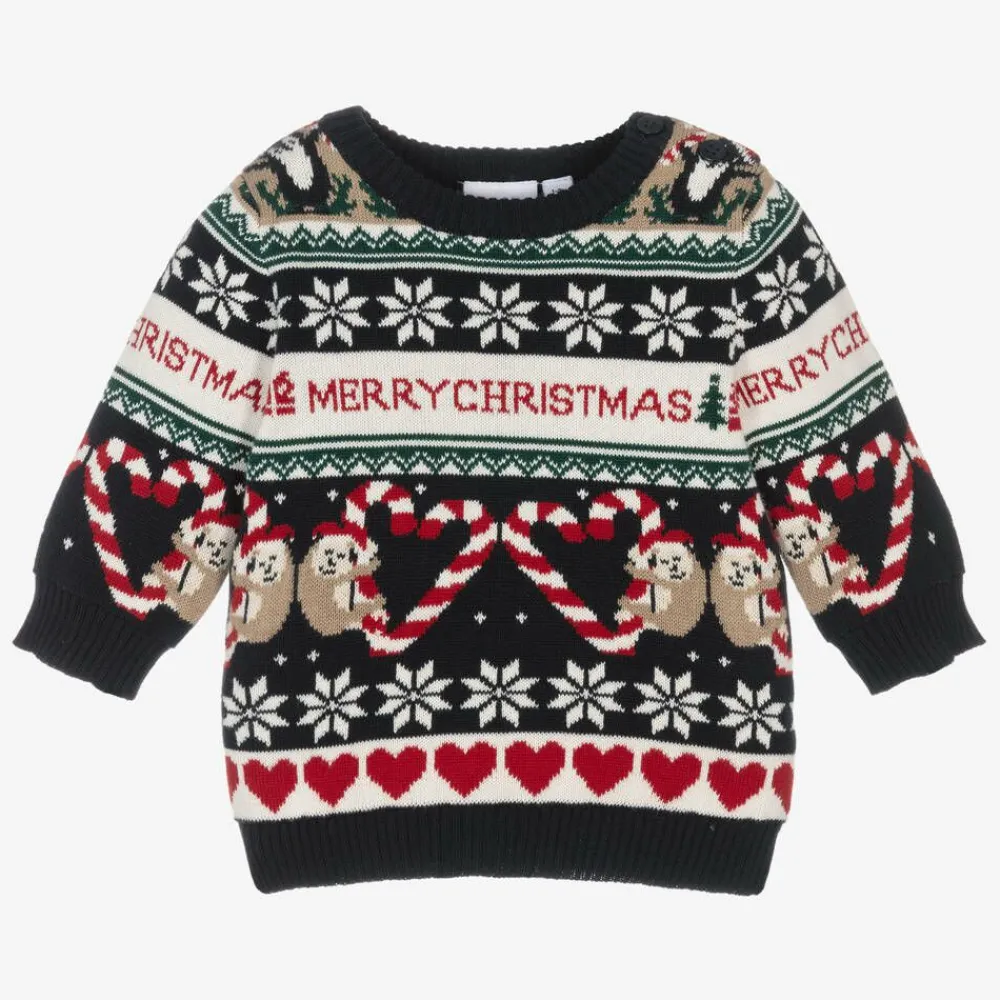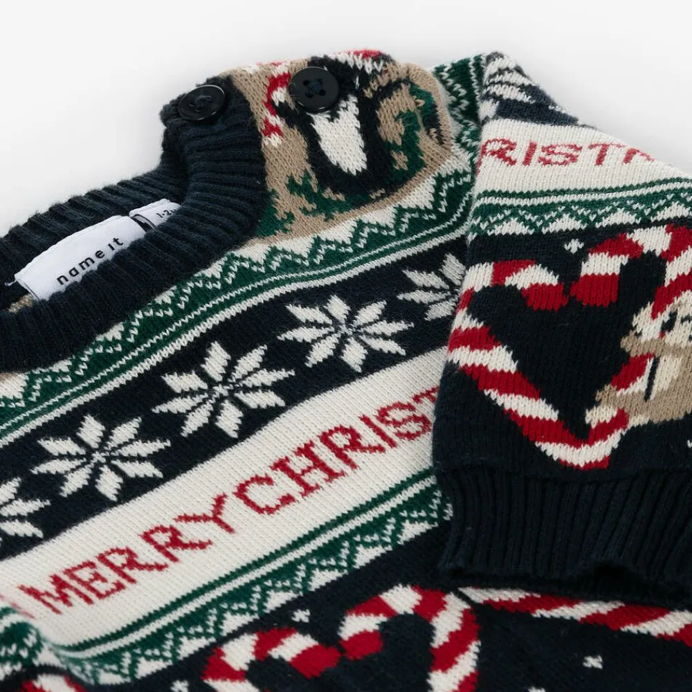 Cute Christmas sweater for boys and girls by Danish brand Name It, patterned with penguins, snowflakes, bears and sugar canes. Knitted in lightweight cotton, it has long sleeves, cosy ribbed trims and buttons on one shoulder to help with dressing.