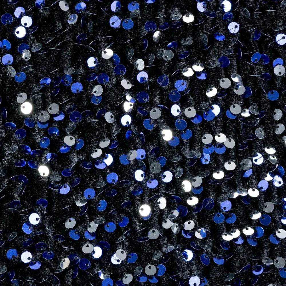Super sparkly, black velour Name It trousers for girls, covered in shiny silver and blue sequins. Stylish yet comfortable for a glamorous party look, this flared style has a stretchy waistband with adjustable elastic for an ideal fit. A soft and stretchy jersey lining adds a gentle feel against the skin.