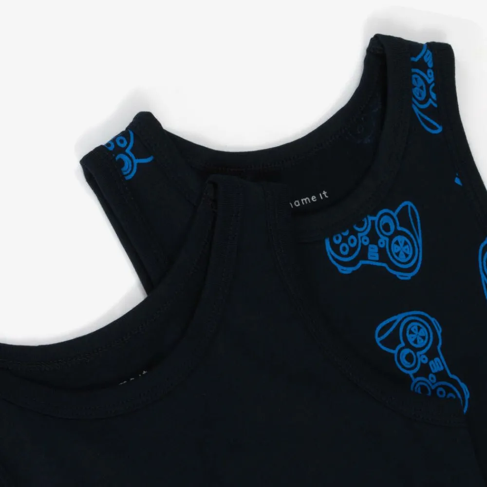 Pack of two navy blue vests for boys by Danish brand Name It, made in soft and stretchy cotton jersey. One vest is plain blue and the other has a contrast blue games console pattern.