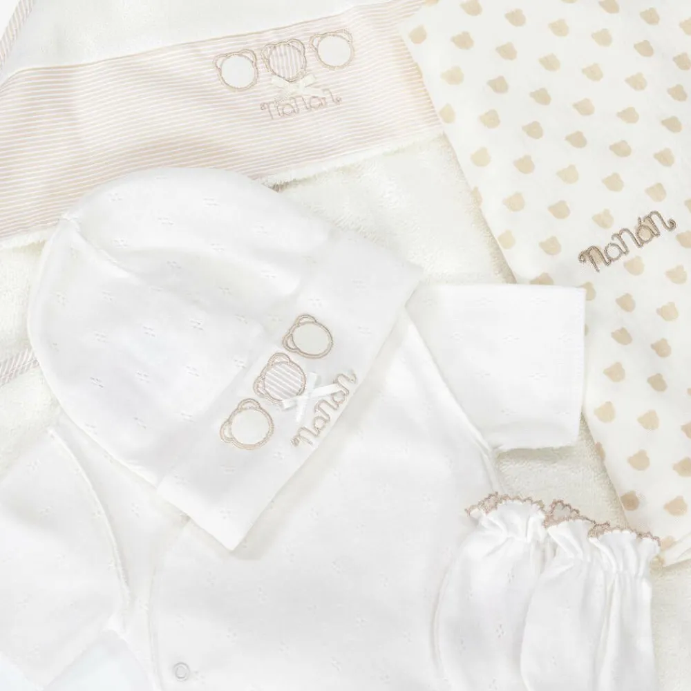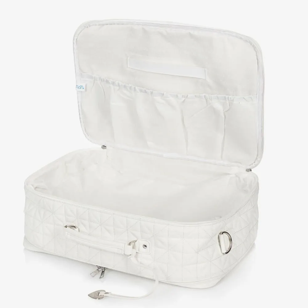 Luxury white suitcase by Nanán, made from faux leather with a diamond quilting pattern and a silky lining. A lovely gift for parents-to-be, it is ideal for use as a hospital or overnight bag and comes with a babygrow, bodyvest, hat, mittens, muslin and towel, all in beautifully soft organic cotton. The bag has two zipped compartments with useful internal pockets, and a further velcro pocket on the front. There is a useful carry handle and a detachable, adjustable shoulder strap.