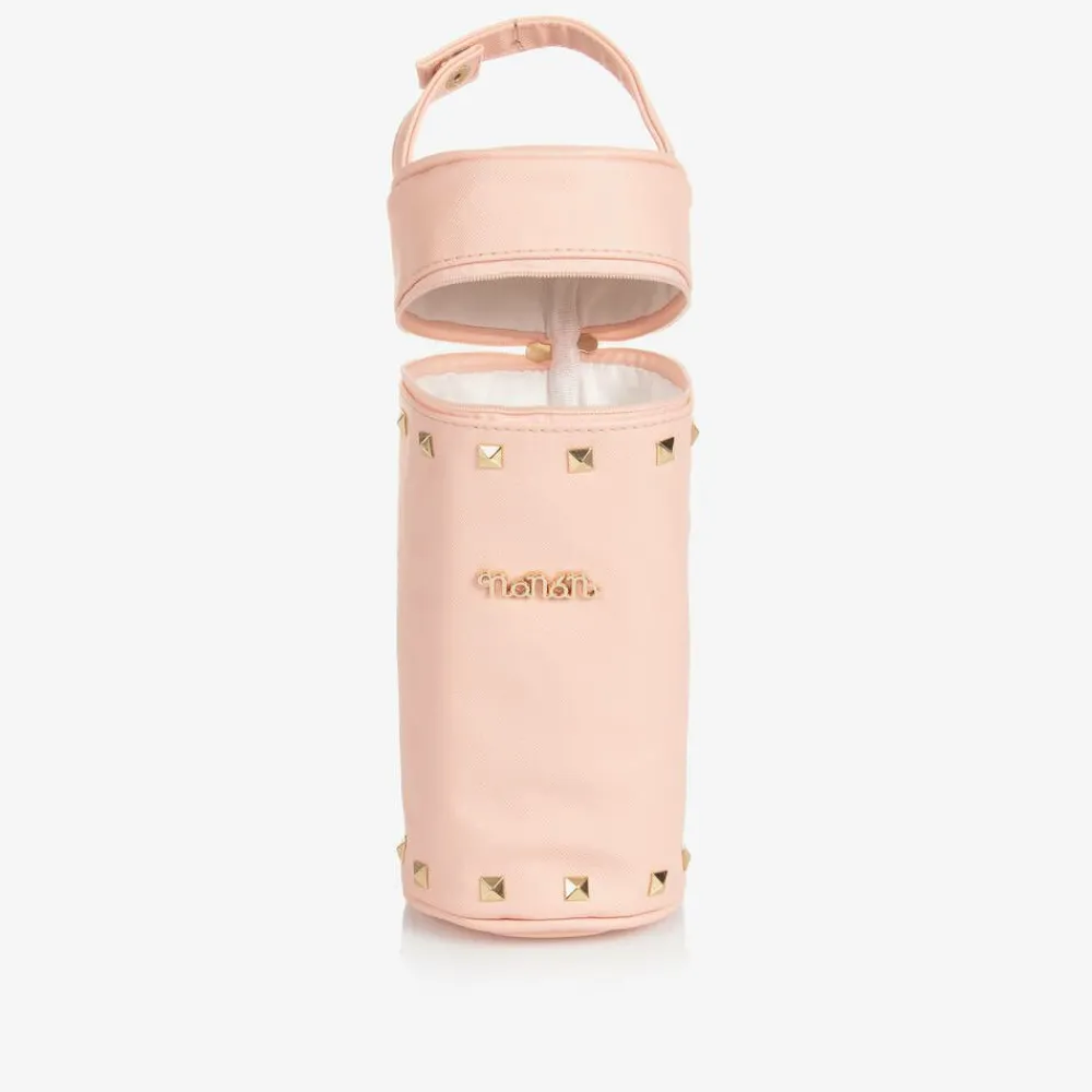 Stylish pink bottle bag for baby girls by Italian brand, Nanán. The wipe-clean outer surface has a textured pattern, gold metal studs for a luxurious finish and a gold metal logo. Lined in logo jacquard satin, the bag has a popper-fastening carry handle and double zip-fastening closure.