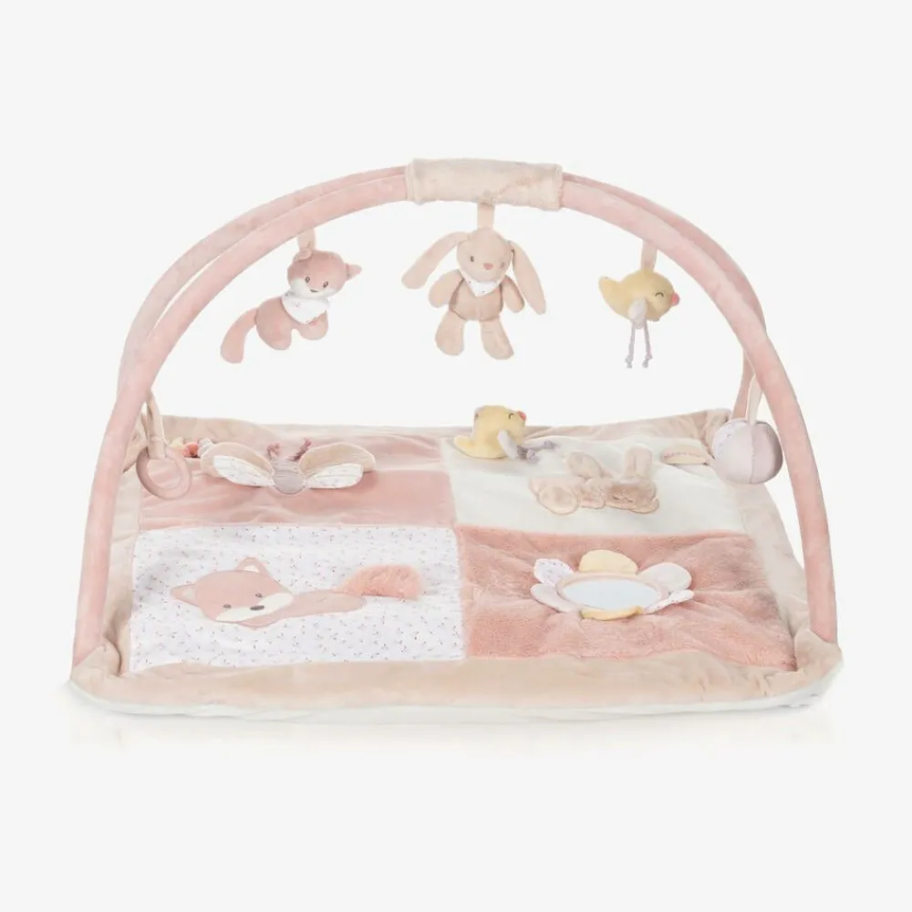 Lovely pink playmat for baby girls by Nattou, made in luxuriously soft plush. Padded for comfort, this fun play accessory includes over twenty five activities for your little one. From crackling paper and rattles to squeakers and silicone rings, it supports children's curious nature, engages all of their senses, and promotes development of their dexterity and fine motor skills. The arches have adorable rattle and squeaker hanging toys, and attach simply onto the mat with easy-to-use buckle clips.