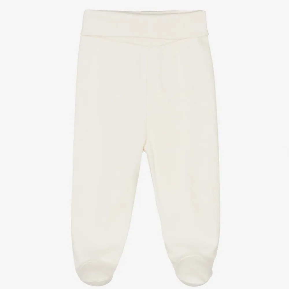Ivory trousers for baby boys and girls from Naturapura. Made in comfortable, brushed organic cotton jersey that is kind to baby's skin, the designer's logo print and cute embroidered teddy bear appliqué are on the back. Easy to wear, they have a stretchy, fold-over waistband and simply pull up.