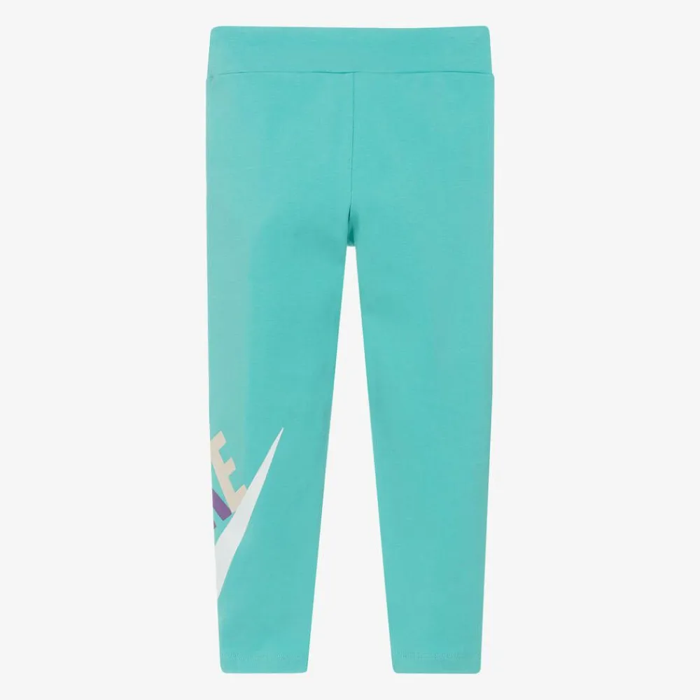 Lovely turquoise green cotton leggings for girls by American sportswear brand Nike. Soft and stretchy for every day casual look, they have a colourful logo and the Swoosh icon printed on one leg.