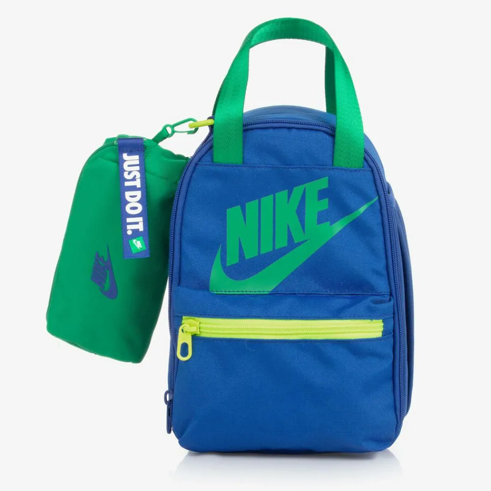 A bright blue canvas lunch bag for boys and girls, unmistakably by American brand Nike with the label's iconic Swoosh logo printed on the front in green. Durable, it has a main, zipped compartment with a smooth, silver, easy-to-clean lining and a smaller zipped pocket on the front, both with branded pull tabs. There are short, green, webbed carry handles on the top, an ID card insert on the back and a water bottle pocket on one side. The bag comes with a separate, green, branded pencil case with the signature 'Just Do It' slogan on the zip pull.