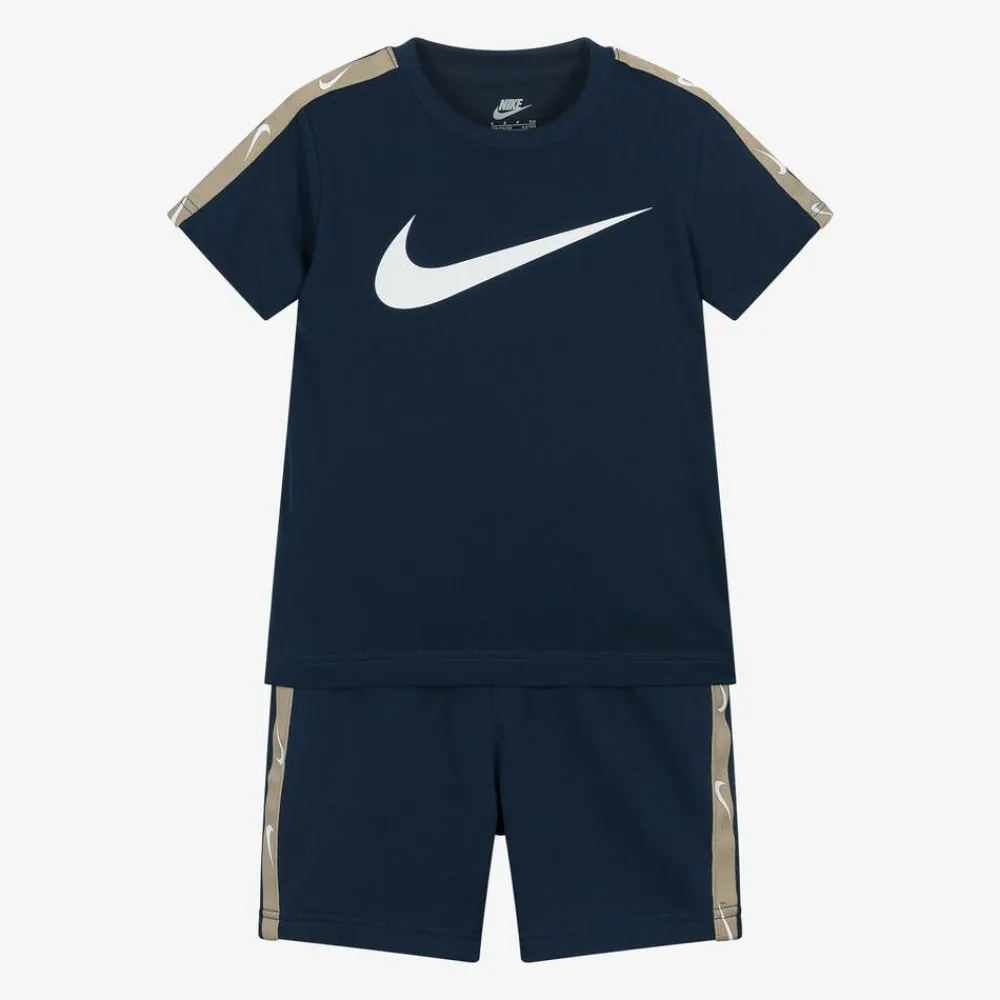 Navy blue shorts set for boys and girls by Nike, made in a comfortable cotton-blend jersey. The top has a signature white Swoosh logo on the front and the shorts have a comfortable elasticated waist. Both pieces are trimmed with striped logo tape in beige, navy blue and white