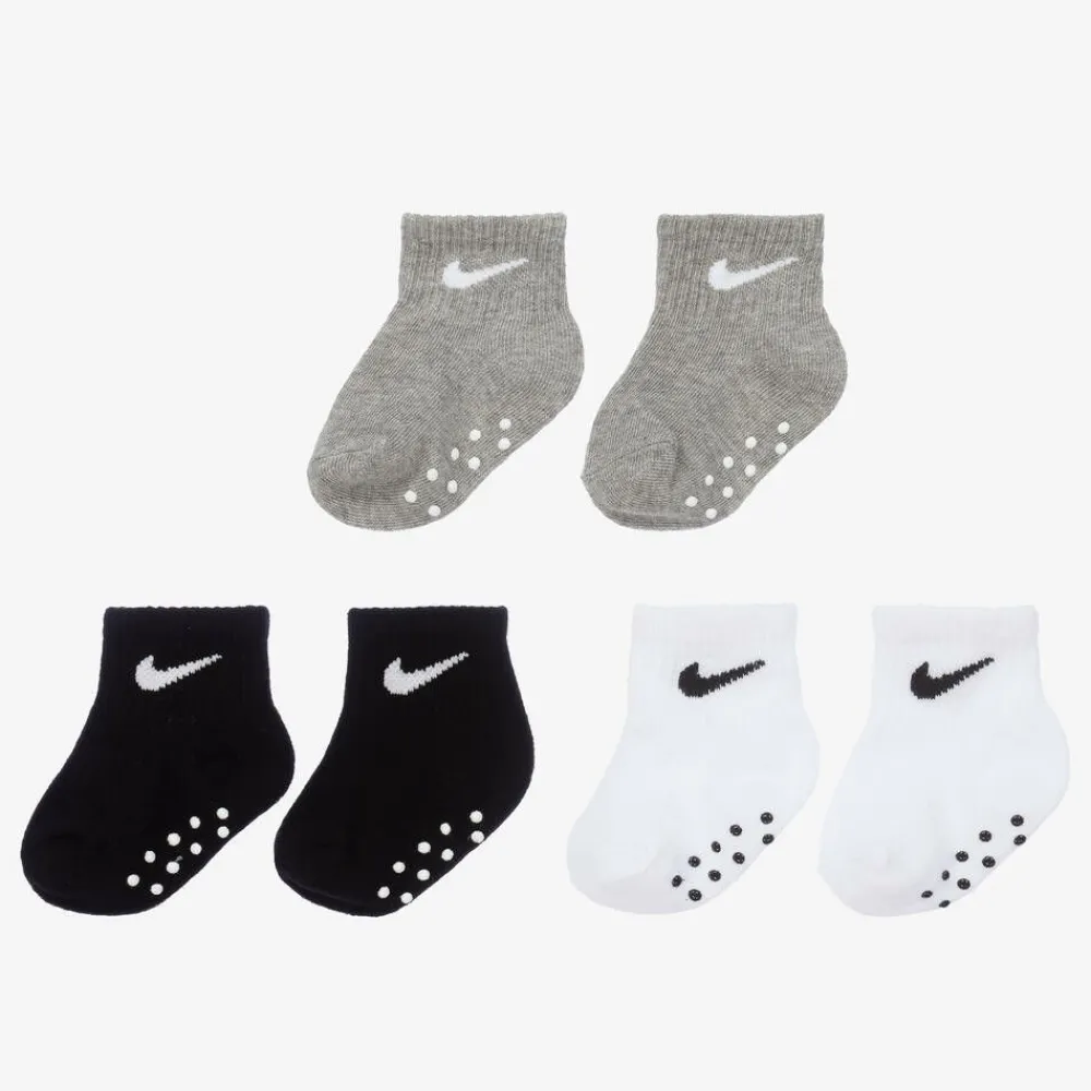 Three pairs of comfortable Nike ankle socks for baby boys, in black, grey and white. Made from a soft and stretchy cotton blend knit with the Swoosh logo and ribbing around the ankle, they have no-slip silicone print grips underneath.