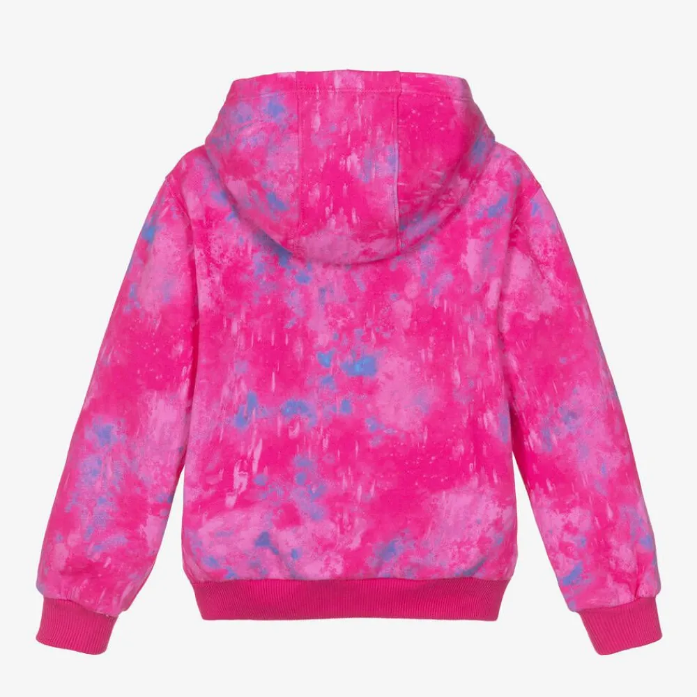 A fuchsia pink hoodie for girls by Nike, made from super soft cotton jersey. Fun for casual days, it has a purple tie-dye paint effect with a blue Nike Swoosh logo printed on the front. It is finished with a pouch pocket and stretchy ribbed trims.