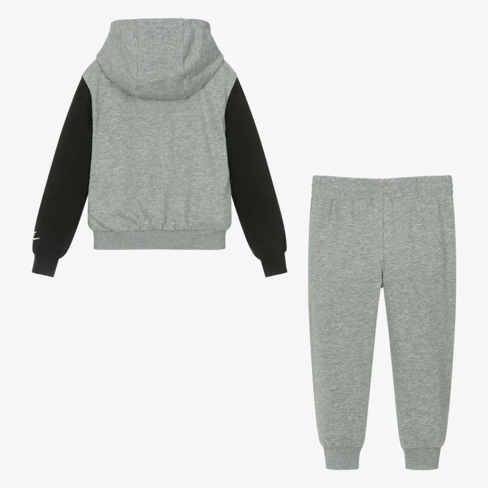 Grey tracksuit for boys by American sportswear brand Nike, made in soft and stretchy cotton jersey. The hooded top has black sleeves and a contrasting blue lining in the hood. There is a pouch pocket on the front and a colourful 'Just Do It' Swoosh logo on the chest. A smaller white Swoosh logo features on one sleeve. The joggers have a matching logo on the front and an elasticated waist for a comfortable fit.