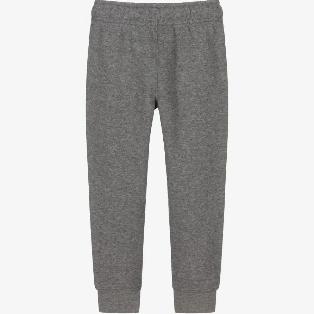 Boys grey joggers by sports brand, Nike. The soft cotton-blend jersey has a fleece feel, with a brushed fleece interior. They have an adjustable drawstring waist, white logo embroidery and side pockets.
