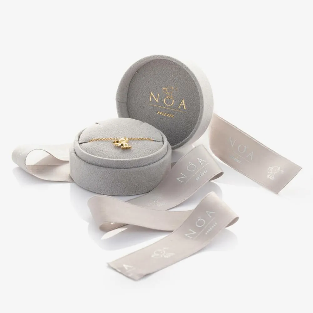 Dainty gold bracelet for little boys and girls by NOA Mini, beautifully hand crafted in Italy. This timeless keepsake is designed to be passed through generations. Set on a fine 18 karat yellow gold chain, the charming elephant pendant is detailed with exquisite white diamonds. With stunning shine, it can be worn as a bracelet or anklet. Ideal as a gift for a special new arrival, it comes presented in a bow-tied velvet gift box with a lovely Steiff elephant. The cuddly Steiff elephant toy can be your baby's first friend, reminding them of their special bracelet for years to come.