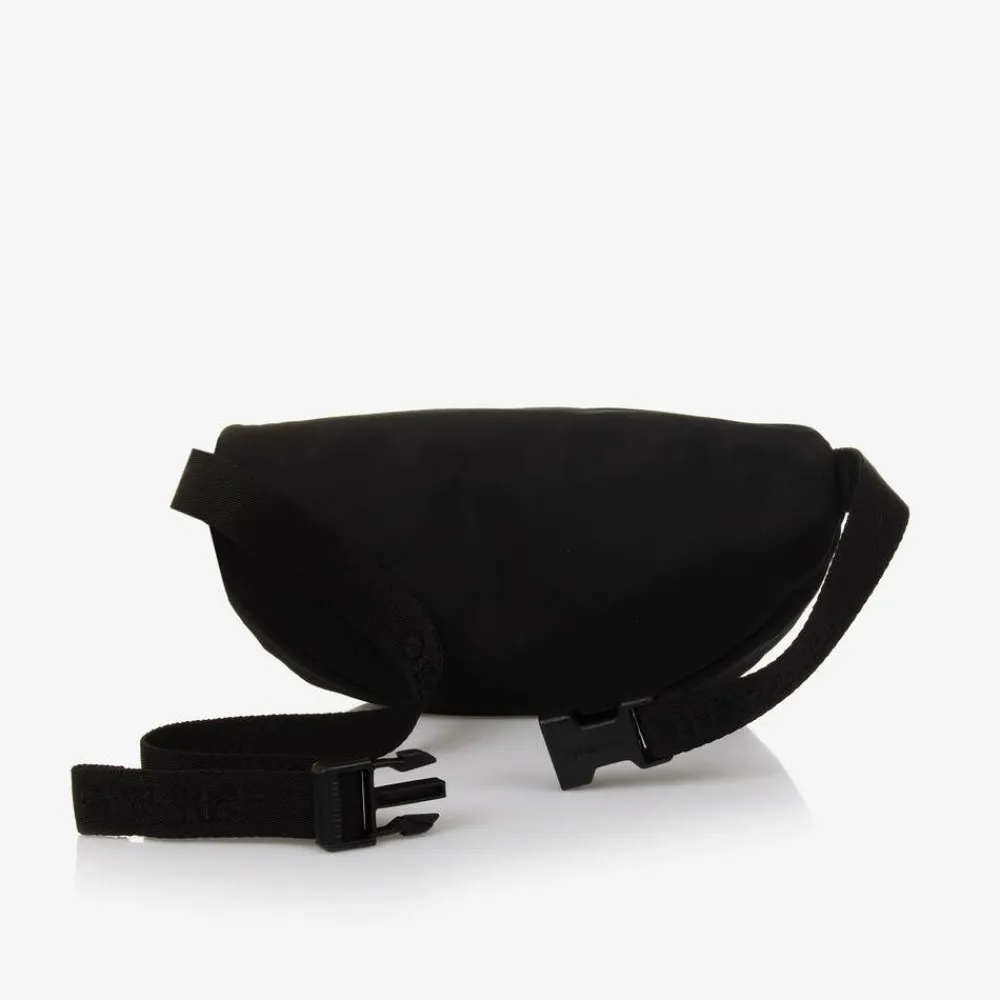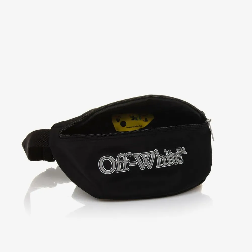A stylish black belt bag for boys by luxury brand Off-White, boldly branded with a grey bookish logo on the front. For both style and practicality, this zip-up bag is made in silky smooth fabric with a lined compartment. The adjustable webbed strap has jacquard lettering all around and fastens with a black buckle clip.