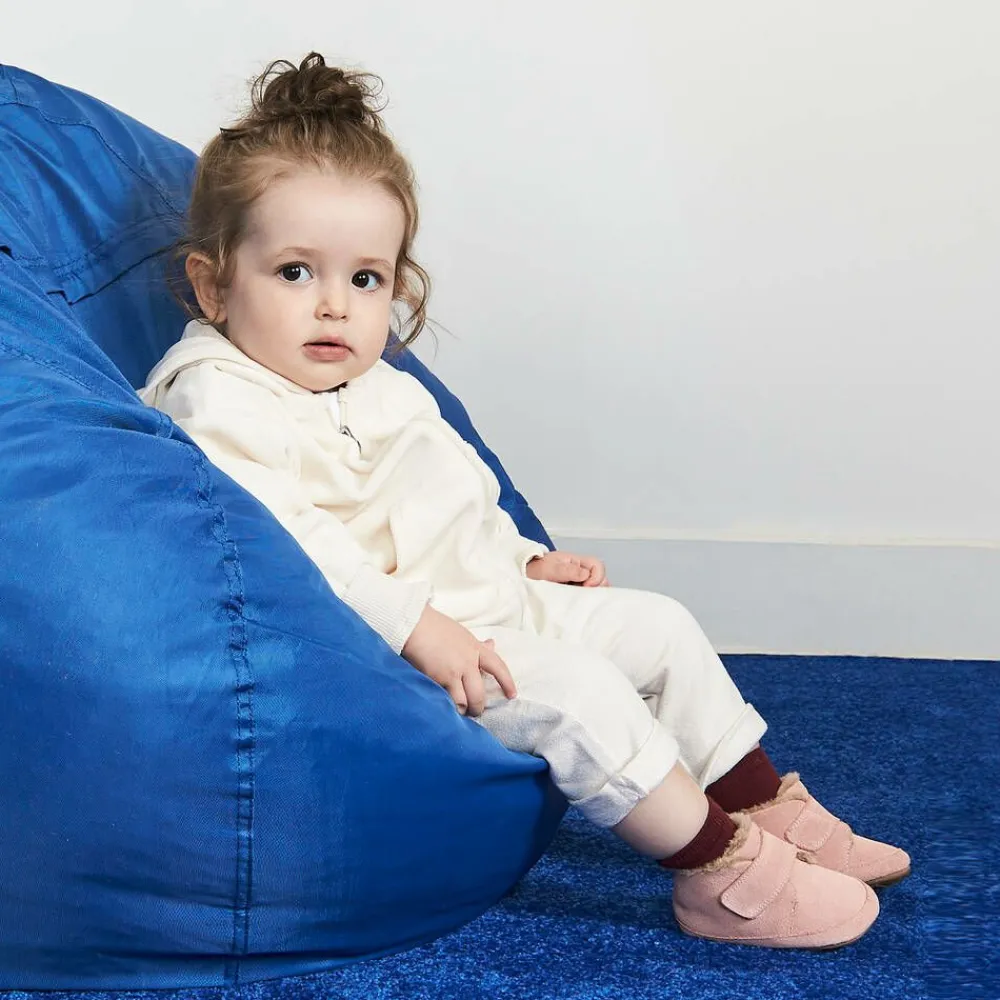 Pink suede leather first walker shoes for little girls from Old Soles, with a cosy faux fur lining. Fastening with an adjustable velcro strap, these soft and supple shoes are designed to promote natural movement and healthy foot growth, with plenty of room for wiggly toes. They have a removable, antibacterial, cushioned insole and a thin but grippy outer sole that allows for natural development of sensation, balance and strength as little ones transition from crawling to cruising and walking.