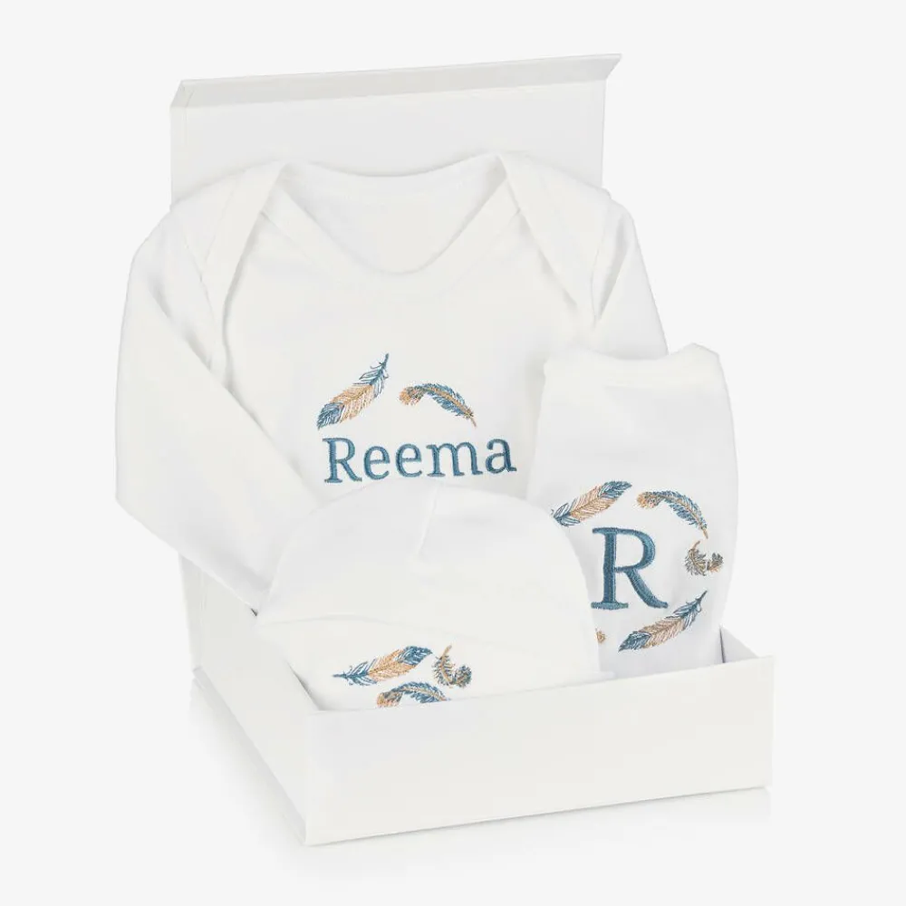 White cotton babysuit gift set for little boys and girls by Paint My Dreams, exclusive to Childrensalon. Lovely as a thoughtful gift for a special new arrival, each of the pieces are delicately embroidered with your child's name, initial and sweet feathers. The babygrow has a wide, envelope neckline to help with dressing and useful poppers between the legs. The dribble bib fastens with a popper on the back of the neck. An adorable layette hat completes the lovely set, which is beautifully presented in a branded gift box.
