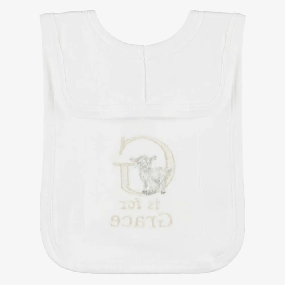 Cute white bib for baby boys and girls by Paint My Dreams, the British label. Made in soft cotton jersey for gentle comfort against delicate skin, this useful feeding accessory is ideal for catching small spills and dribble, and simply slips on over the head. Your little one's name can be embroidered below the 'G' initial and sweet goat motif, making a thoughtful gift.
