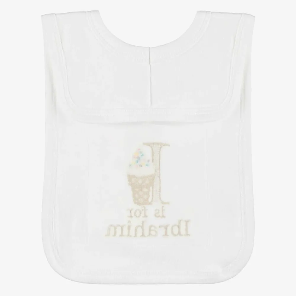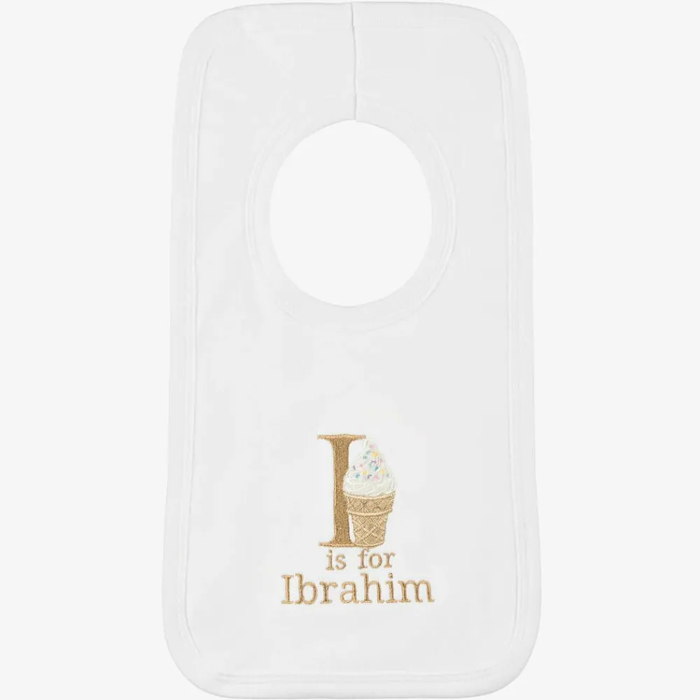 Cute white bib for baby boys and girls by Paint My Dreams, the British label. Made in soft cotton jersey for gentle comfort against delicate skin, this useful feeding accessory is ideal for catching small spills and dribble, and simply slips on over the head. Your little one's name can be embroidered below the 'I' initial and sweet ice cream motif, making a thoughtful gift.