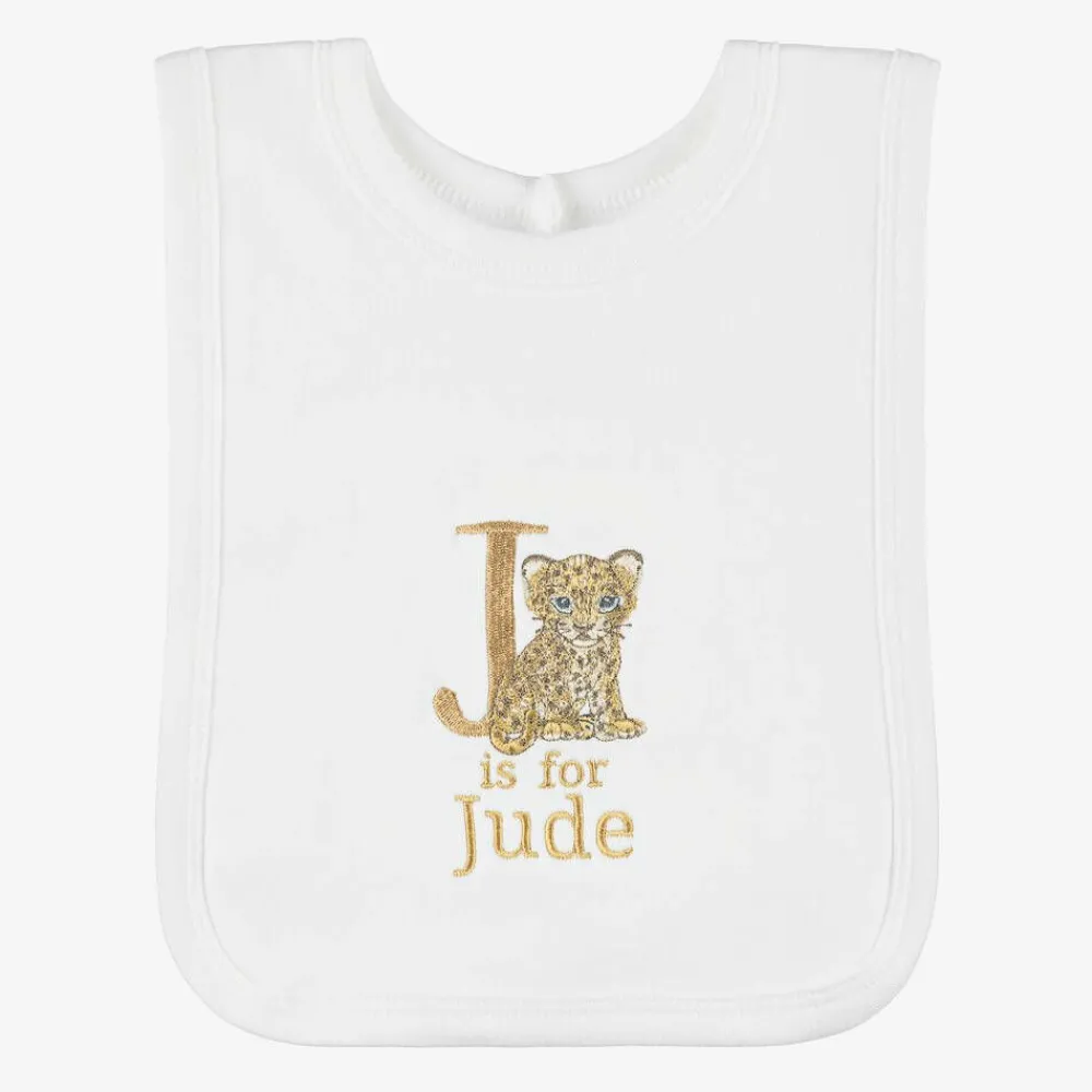 Cute white bib for baby boys and girls by Paint My Dreams, the British label. Made in soft cotton jersey for gentle comfort against delicate skin, this useful feeding accessory is ideal for catching small spills and dribble, and simply slips on over the head. Your little one's name can be embroidered below the 'J' initial and sweet jaguar cub motif, making a thoughtful gift.