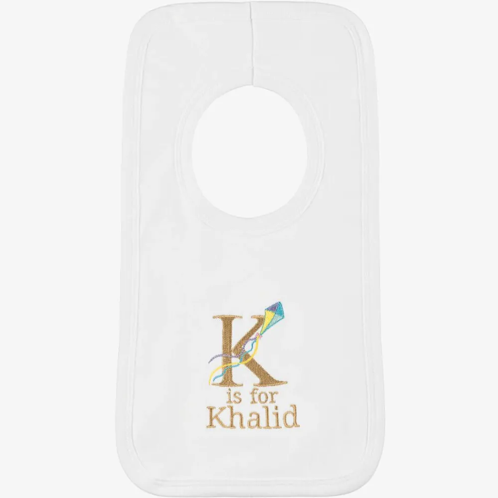 Cute white bib for baby boys and girls by Paint My Dreams, the British label. Made in soft cotton jersey for gentle comfort against delicate skin, this useful feeding accessory is ideal for catching small spills and dribble, and simply slips on over the head. Your little one's name can be embroidered below the 'K' initial and sweet flying kite motif, making a thoughtful gift.