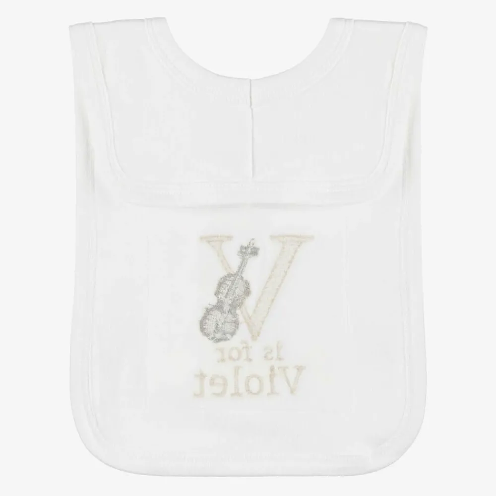 Cute white bib for baby boys and girls by Paint My Dreams, the British label. Made in soft cotton jersey for gentle comfort against delicate skin, this useful feeding accessory is ideal for catching small spills and dribble, and simply slips on over the head. Your little one's name can be embroidered below the 'V' initial and sweet violin motif, making a thoughtful gift.