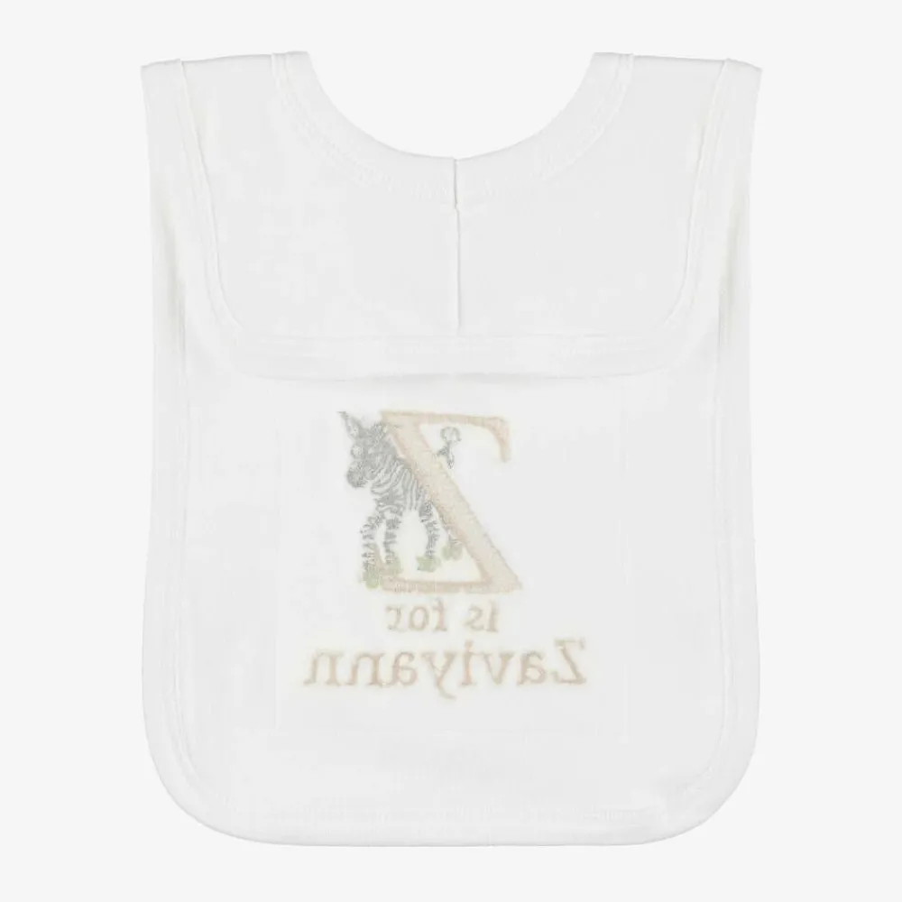 Cute white bib for baby boys and girls by Paint My Dreams, the British label. Made in soft cotton jersey for gentle comfort against delicate skin, this useful feeding accessory is ideal for catching small spills and dribble, and simply slips on over the head. Your little one's name can be embroidered below the 'Z' initial and sweet zebra motif, making a thoughtful gift.