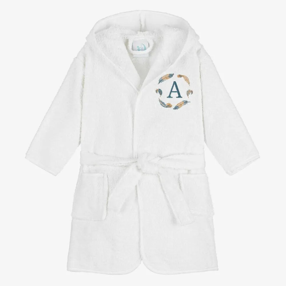 Lovely white hooded bathrobe for little boys and girls by British brand, Paint My Dreams. Made in soft cotton towelling, it is delicately embroidered with your child's initial on the chest, surrounded by sweet blue and beige feathers. There is a tie belt around the waist to simply fasten the style.