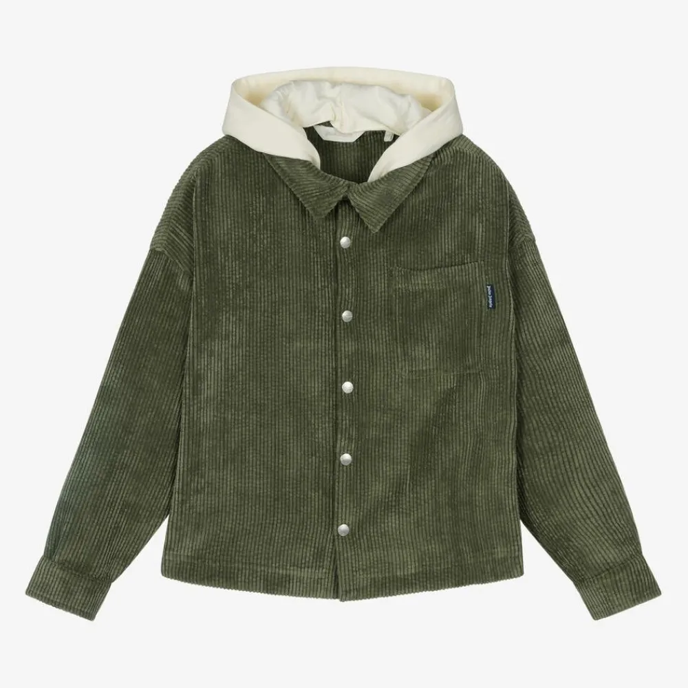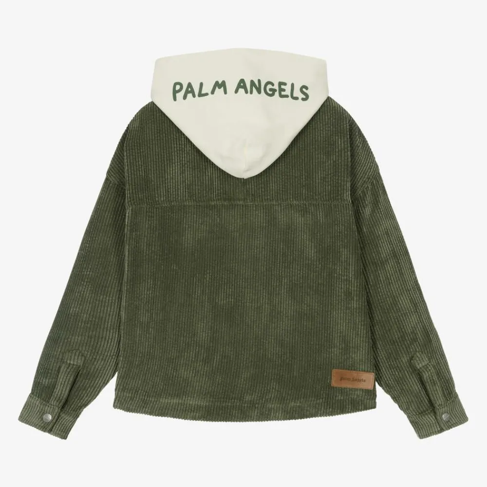Khaki green overshirt for older boys from Palm Angels, made in soft and comfortable corduroy. Designed in a relaxed, oversized fit, this cool shaket has a chest patch pocket and logo-embossed popper fastenings on the front and cuffs. For alternative styling, it has a detachable ivory jersey hood, featuring a bold, green logo print for instant designer appeal.