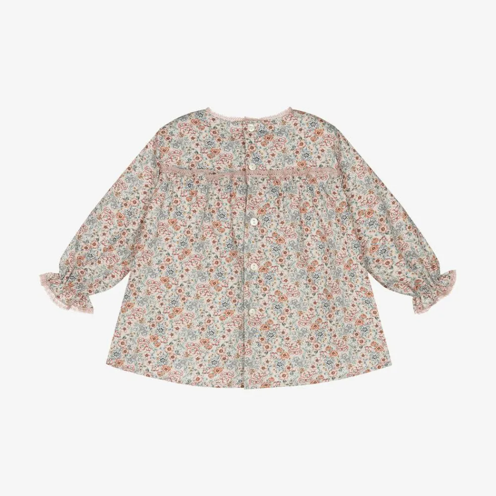 Exclusive to Childrensalon, a delightful dusky pink dress for baby girls by Spanish brand Paloma de la O. Made in soft cotton twill with a lightweight voile lining, this traditional style is patterned in a pretty floral print in pink and blue. It has delicate lace trims, frilly cuffs on the long sleeves, and fastens with pearlescent buttons on the back.