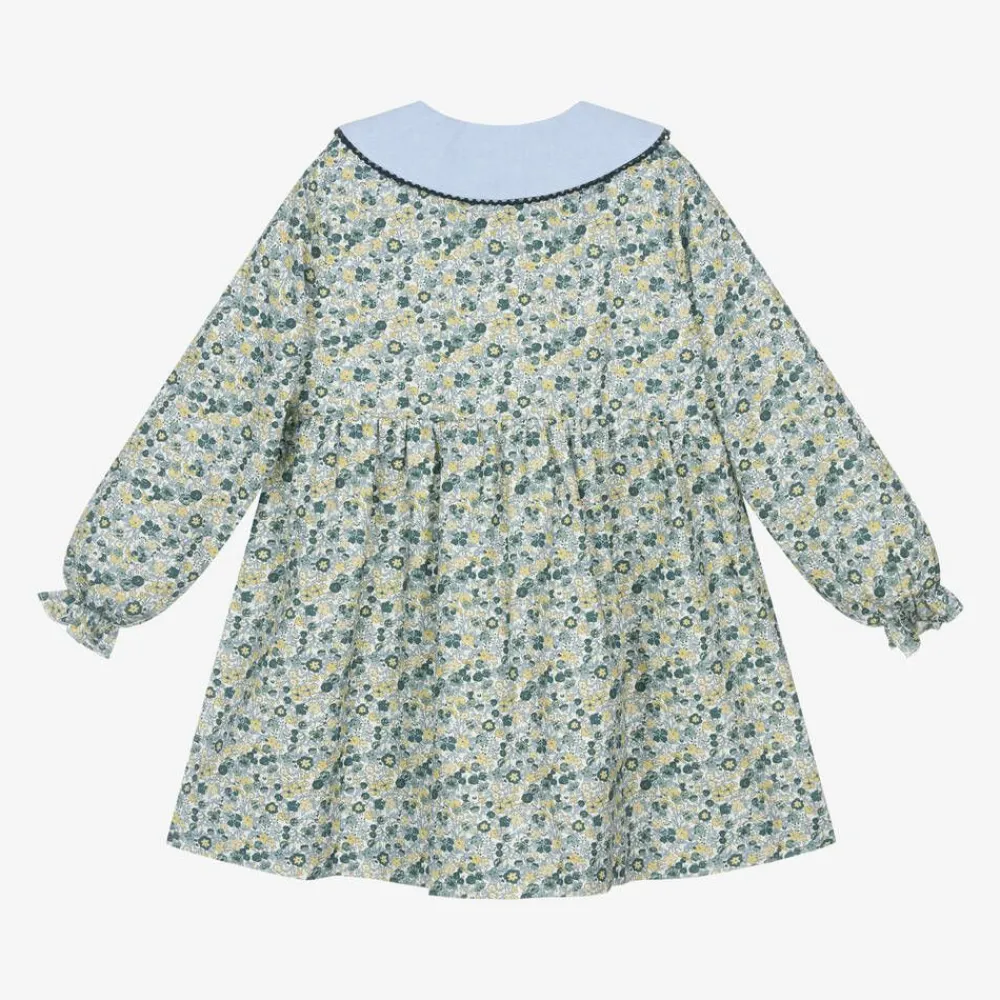 A blue dress for girls by Spanish brand Paloma de la O. It is made in soft cotton twill and patterned in a pretty floral print in shades of blue and pastel chartreuse green. It has a contrasting blue, Oxford cotton collar, trimmed in delicate lace and decorated with beautiful floral embroidery. Lined in lightweight voile for comfort, this traditional style has frilly cuffs on the long sleeves and fastens with tonal buttons on the front.