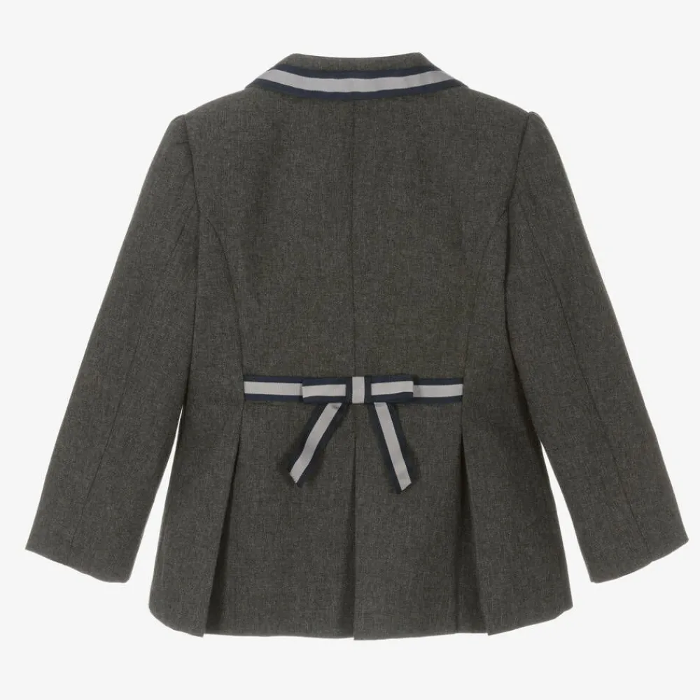 Exclusive to Childrensalon, this grey blazer for girls is by Patachou. Smart and stylish, it is made from a smooth cotton-blended weave with a lightweight silky lining. To enhance the preppy look, there are blue striped grosgrain ribbon trims on the revere collar, front flap, and the back. Fastening with crest-embossed buttons on the front, it has a logo patch with silver ebroidered detailing stitched on the chest for a sweet finish.
