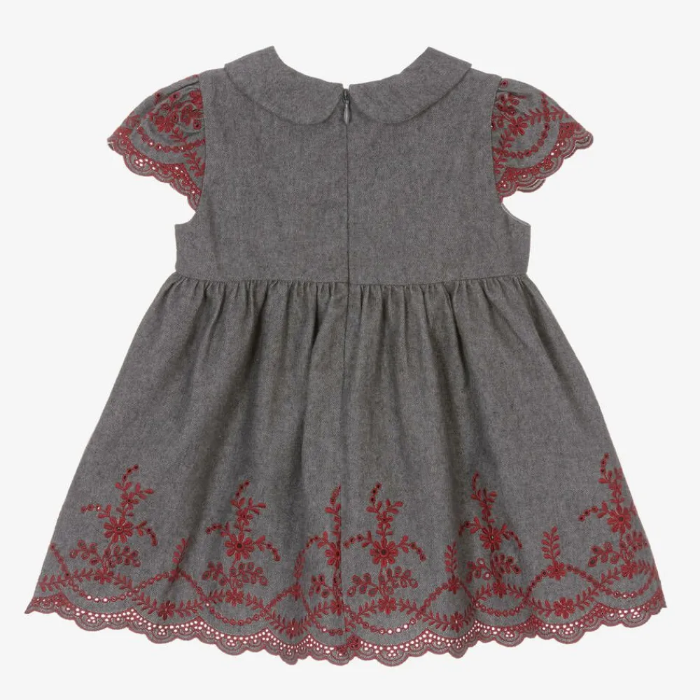 Lovely for a smart or special occasion, this elegant grey dress for girls is by Patachou. It is made in softly brushed cotton twill and decorated with floral broderie anglaise in red. There is a classic Peter Pan collar, capped sleeves, and beautiful scalloped edges. The dress is lined in lightweight for cotton for comfort and fastens neatly with a concealed zip on the back. A velvet ribbon bow and pearlescent logo charm add a pretty finishing touch.