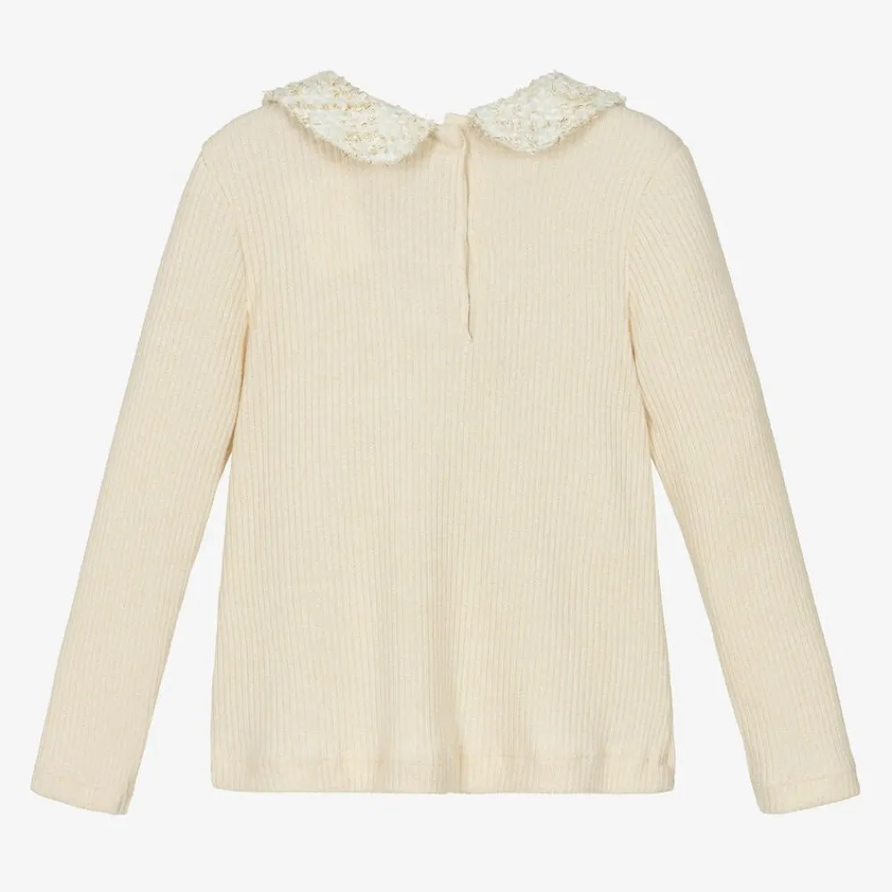 Smart ivory sweater for girls by Portuguese brand Patachou, sparkling with shiny gold thread in the weave. Knitted in a super soft viscose blend, it has a stylish tweed collar with a coordinating, ruffled faux placket below, embellished with a chiffon trim and pearl beads. The sweater has long sleeves and fastens on the back with neat, concealed poppers.