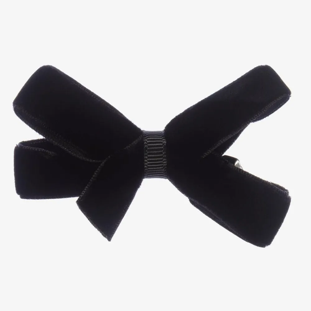 A pretty black velvet bow hair clip for girls by Peach Ribbons, handmade and set on a slide-in metal clip.