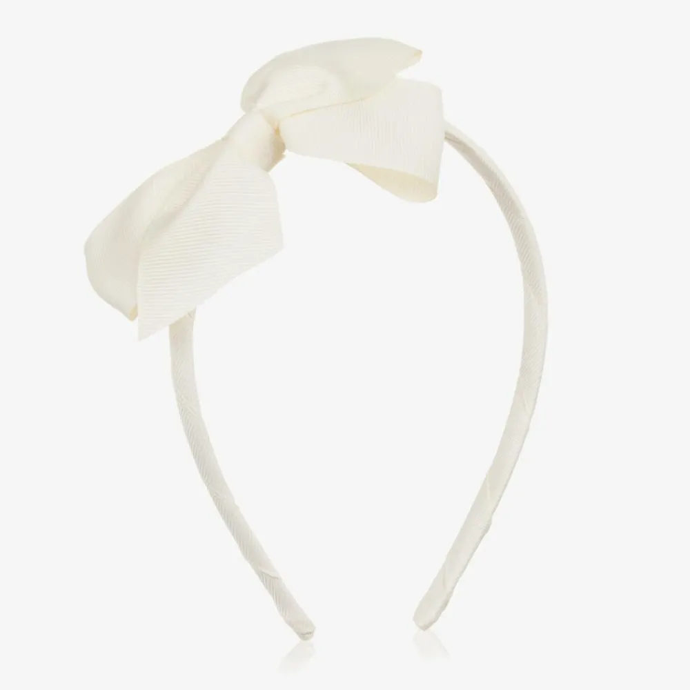 A lovely ivory hairband for girls from Peach Ribbons, ideal to complement an outfit beautifully. Wrapped with grosgrain ribbon, the flexible band is topped with a sweet bow.