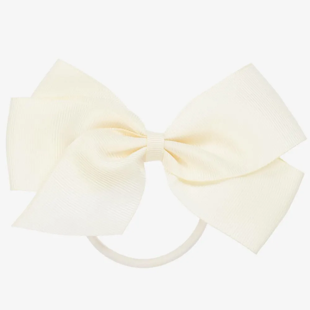 Ivory hair elastic for girls from Peach Ribbons. Lovely to complete an outfit, this pretty accessory has a large handmade grosgrain ribbon bow detail.