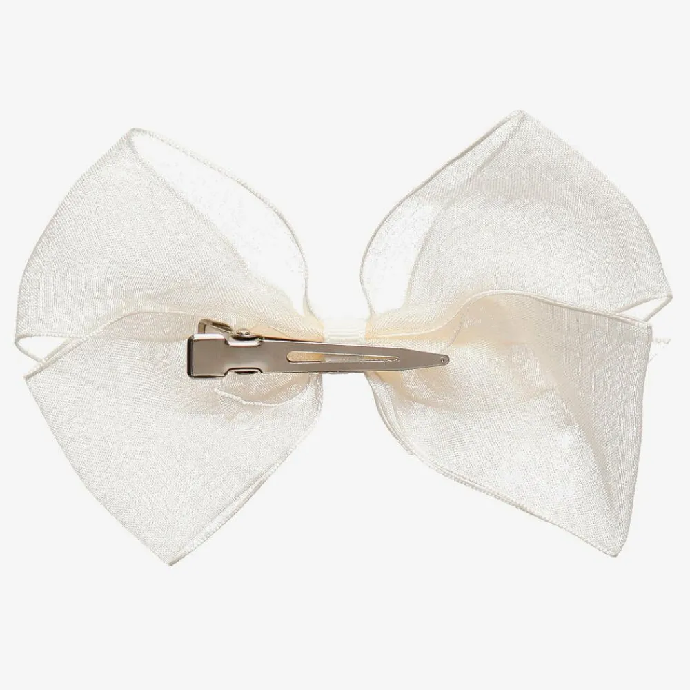 Girls beautiful ivory bow hair clip by Peach Ribbons. So lovely for a special occasion, it is handmade in sheer organza ribbon, with a metal lobster clip to secure to the hair.