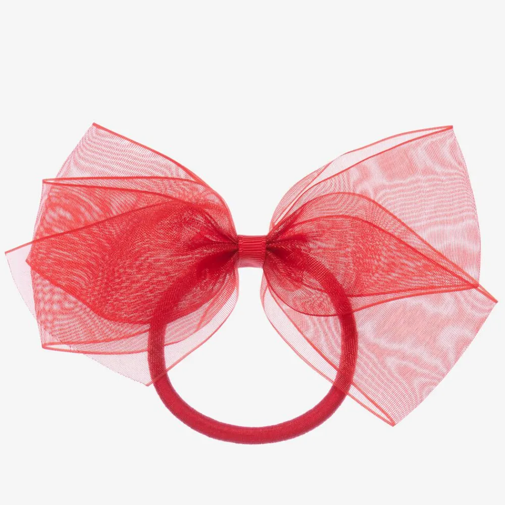 Girls pretty red hair elastic by Peach Ribbons. Decorated with a handmade organza ribbon bow, this lovely accessory would complete any outfit.