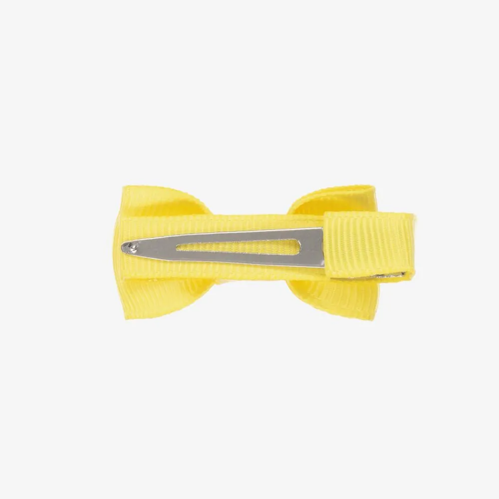 Girls yellow handmade bow hair clip by Peach Ribbons. A finishing touch to an outfit, this sweet accessory is made in grosgrain ribbon and set on a metal clip.