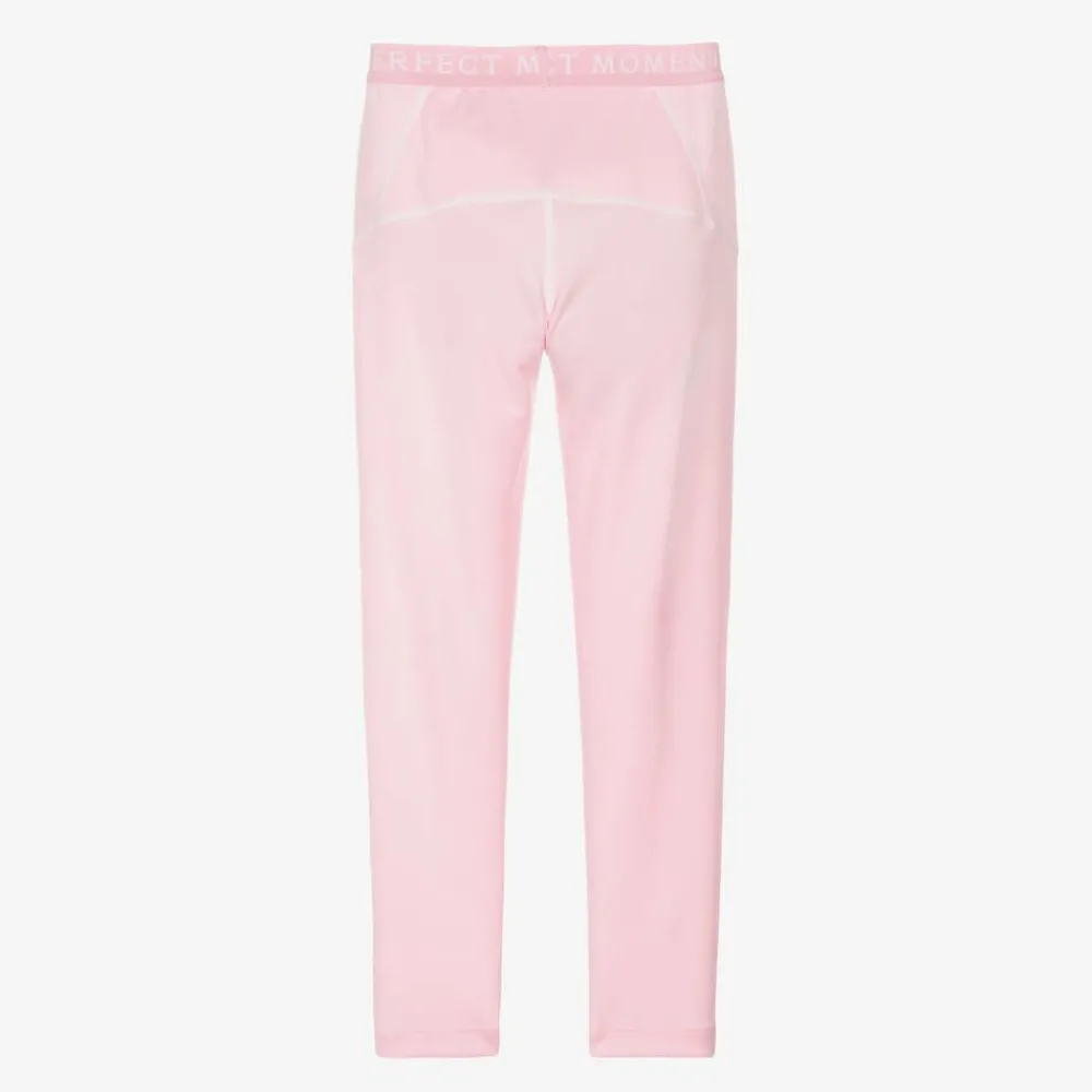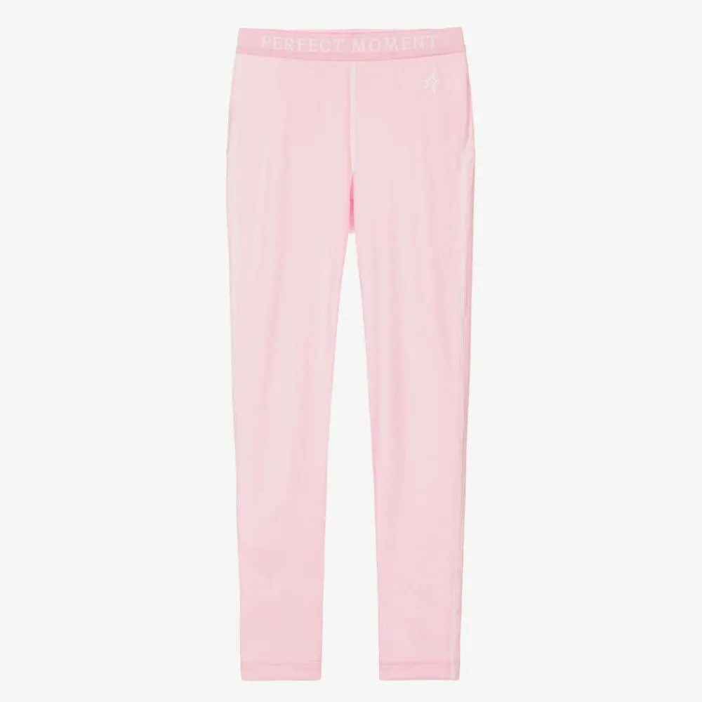 Pink thermal base layer leggings for girls by Perfect Moment, with moisture-wicking qualities. Soft and stretchy, these comfortable leggings are ideal for layering under ski suits. They have a branded elasticated waistband and a white star logo print on the front.