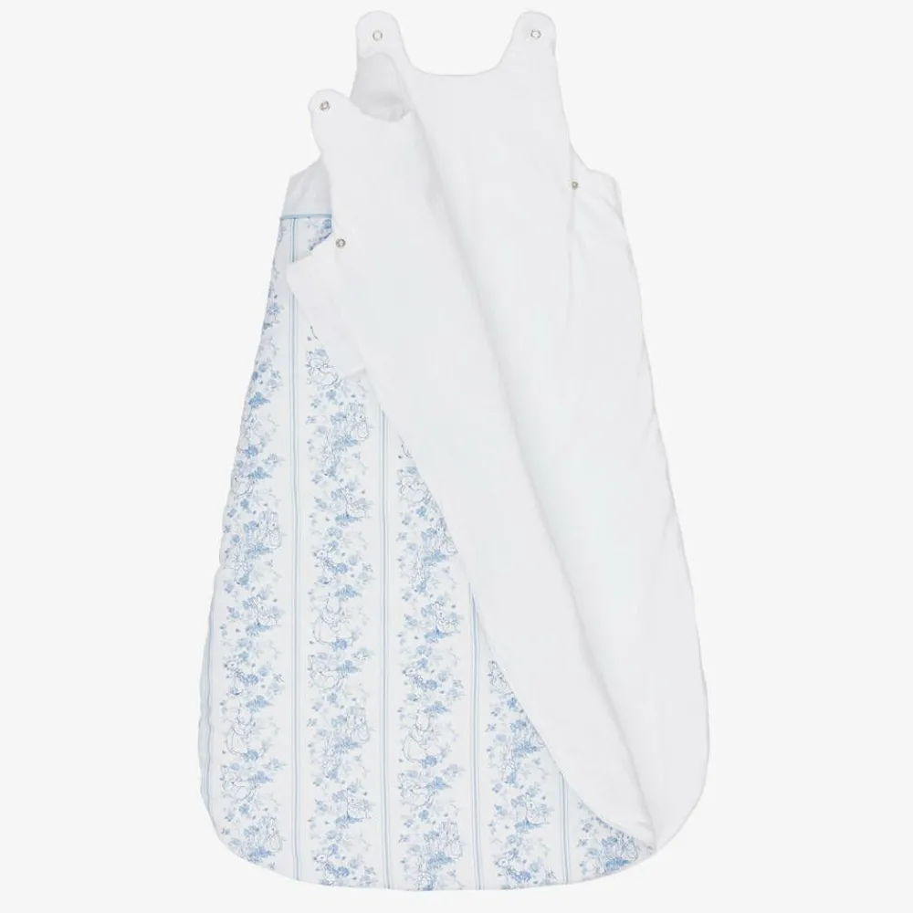 Beautiful white linen and cotton blend sleeping bag for baby boys and girls from Peter Rabbit™ by Childrensalon. It has beautiful, pale blue embroidery of original illustrations by Beatrix Potter at the top, with coordinating stripes printed below. With a Tog value of 2.5, it is lightly padded, and fastens with poppers on the shoulders and a zip that runs down one side and along the bottom. The zip has a protective guard at the top, and there are useful poppers under the arms to allow for growth.The sleeping bag is lined in soft jersey for comfort.